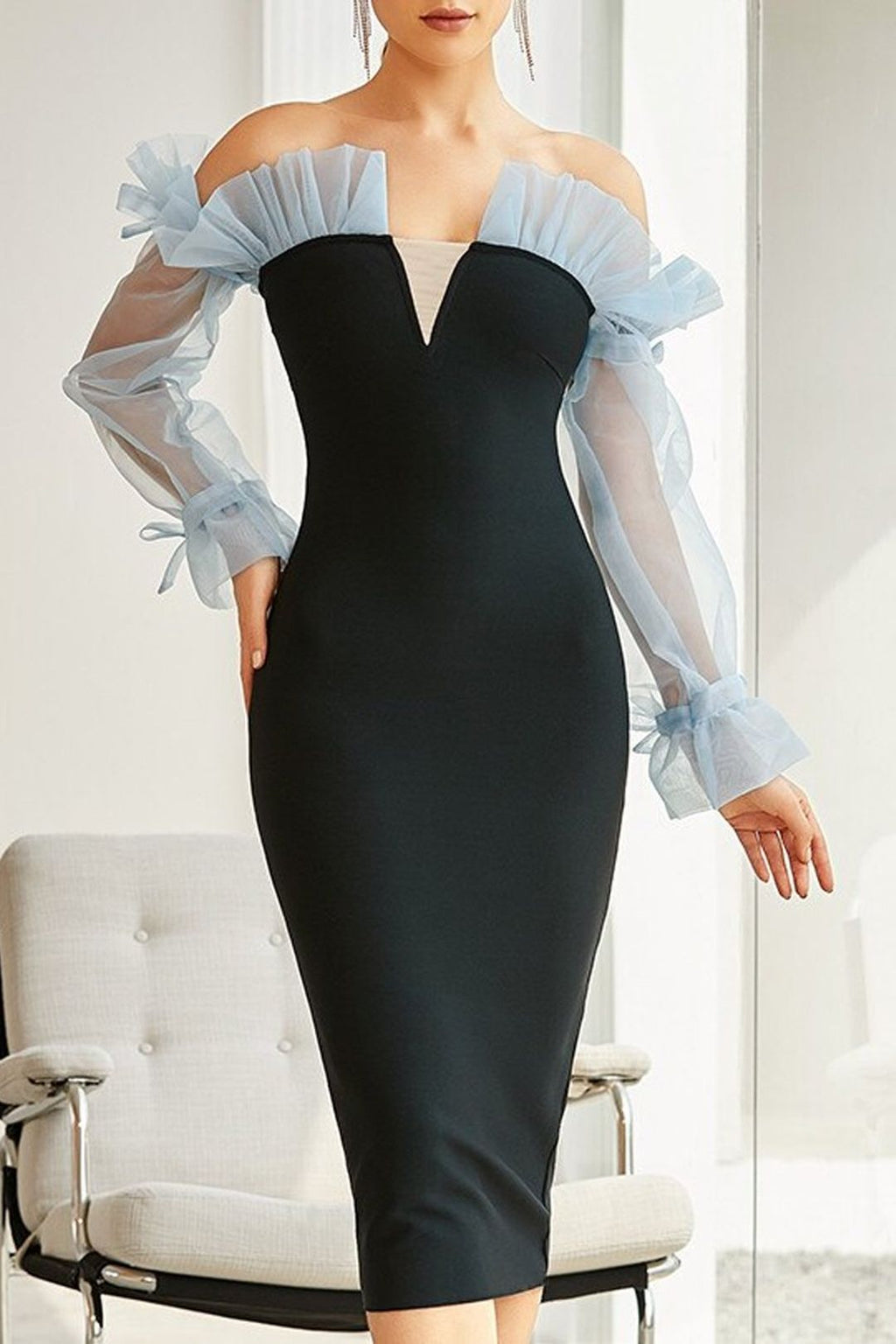 مع الاهتمام بالتفاصيل ، يوفر فستان Midi Midi الذي يتناسب مع شكل نسائي مع الأكمام الزرقاء الفاتحة والصد الفريد تناقضًا فريدًا مع صده المذهل والأكمام المصنوعة من التول الرقيق.