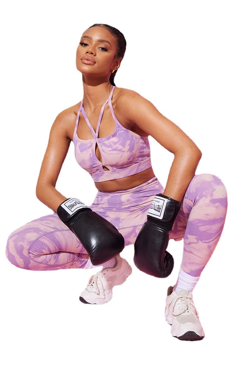 العمل بأسلوب ترتدي أعلى مجموعة من محصول المكونة من القطاعين للسيدات والتي تتميز بنظام ألوان خزامى أرجوانية وخفيفة حالم وخط عنق فريد من نوعه.