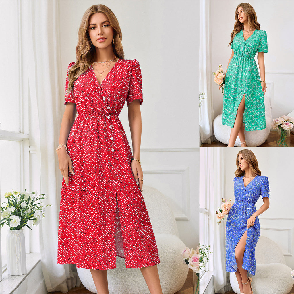 أنيقة ولطيفة ، فستان ميدي للسيدات مع أزرار غير متناظرة. يتوفر هذا الفستان الفريد باللون الأحمر أو الأزرق أو الأخضر لتناسب شخصيتك.