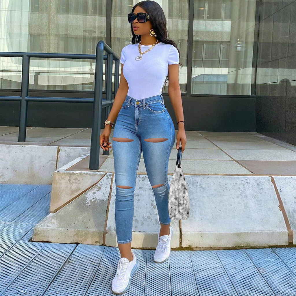 تبدو لطيفًا في أي قمة عندما تقترنها مع جينز الدنيم المرتفع من الخصر بالنساء مع المزج. وتقطع هذه الجينز الناعم على الفخذين والركبتين بالدموع النظيفة.