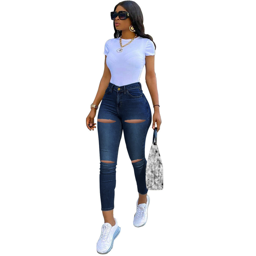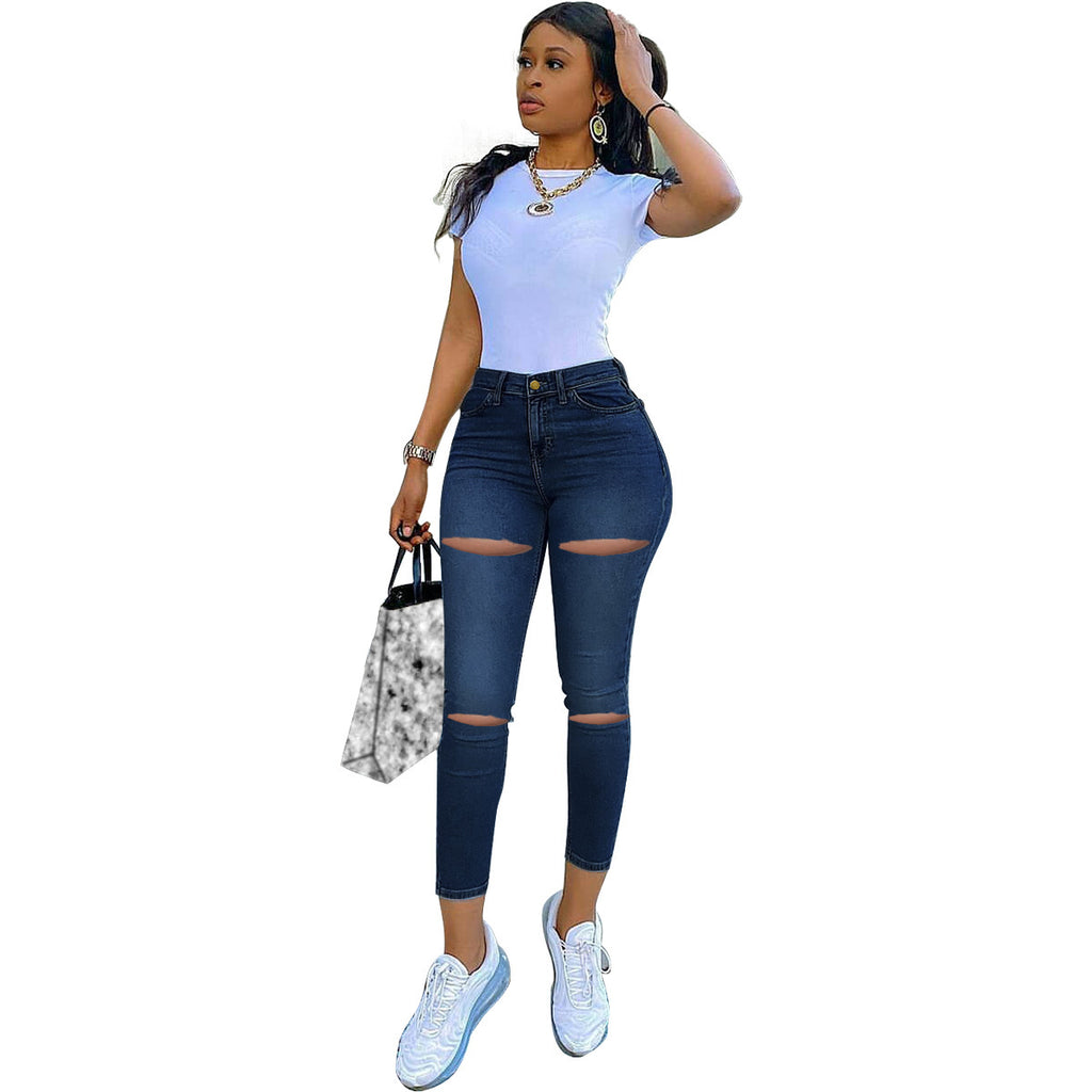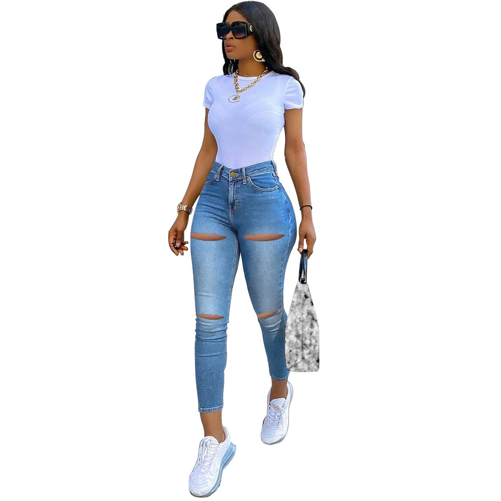 جينز الدنيم المرتفع الخصر للسيدات مع مزقات