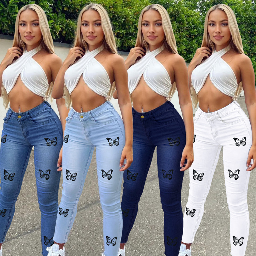 جينز الدنيم الضيق للسيدات مع رسومات الفراشة