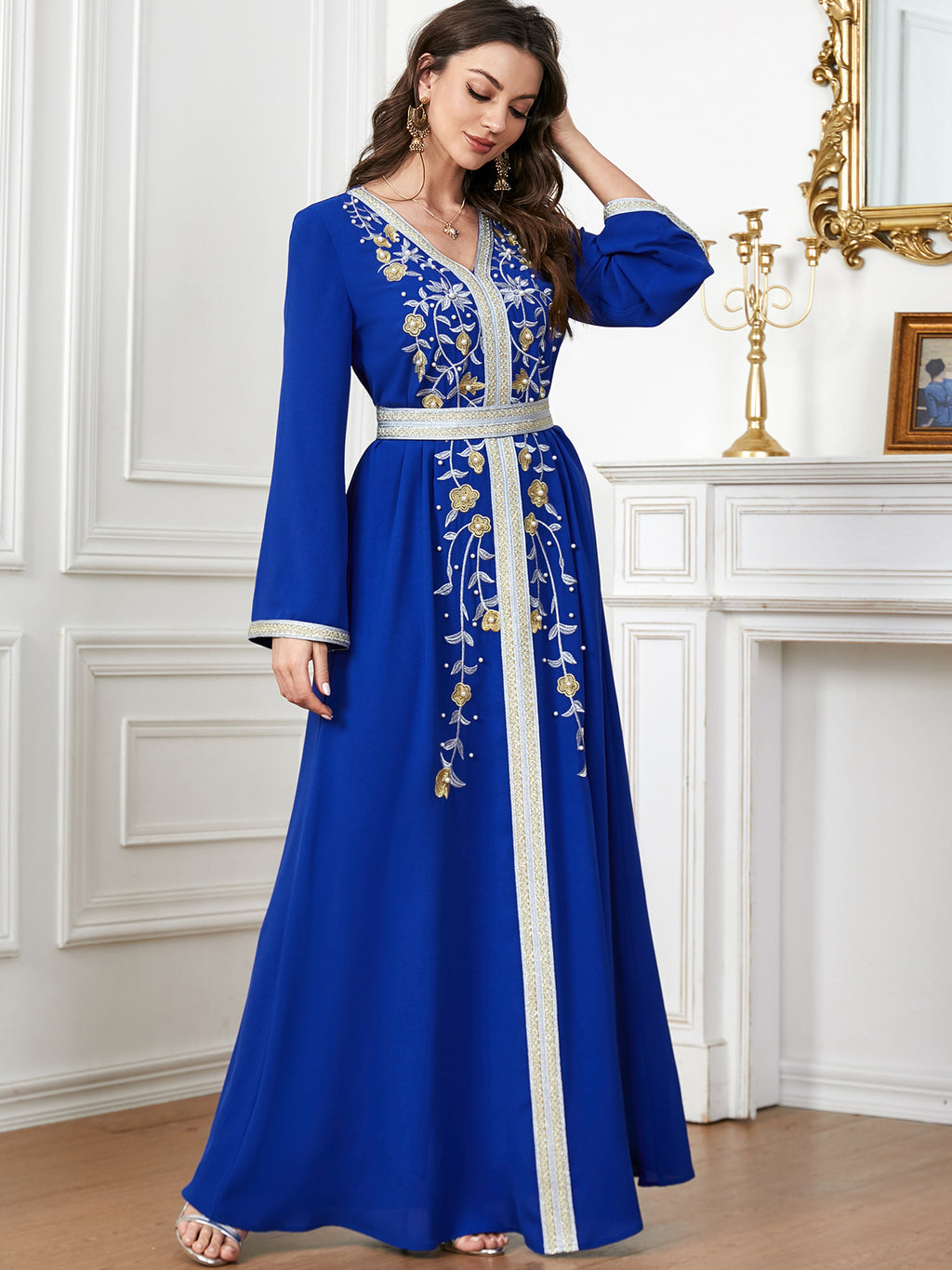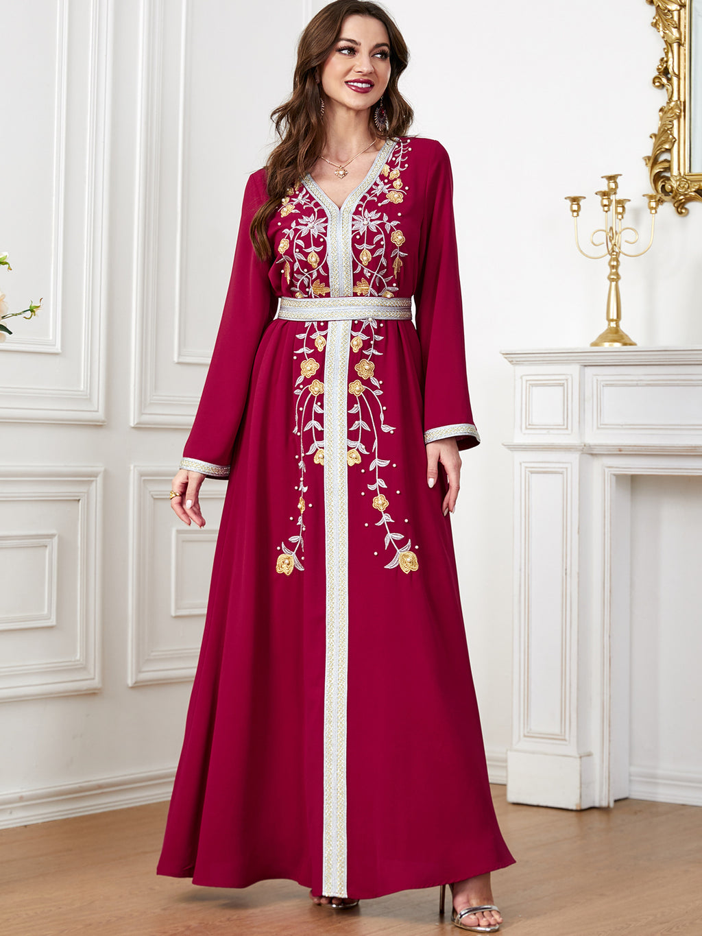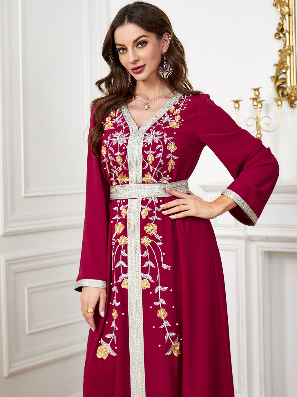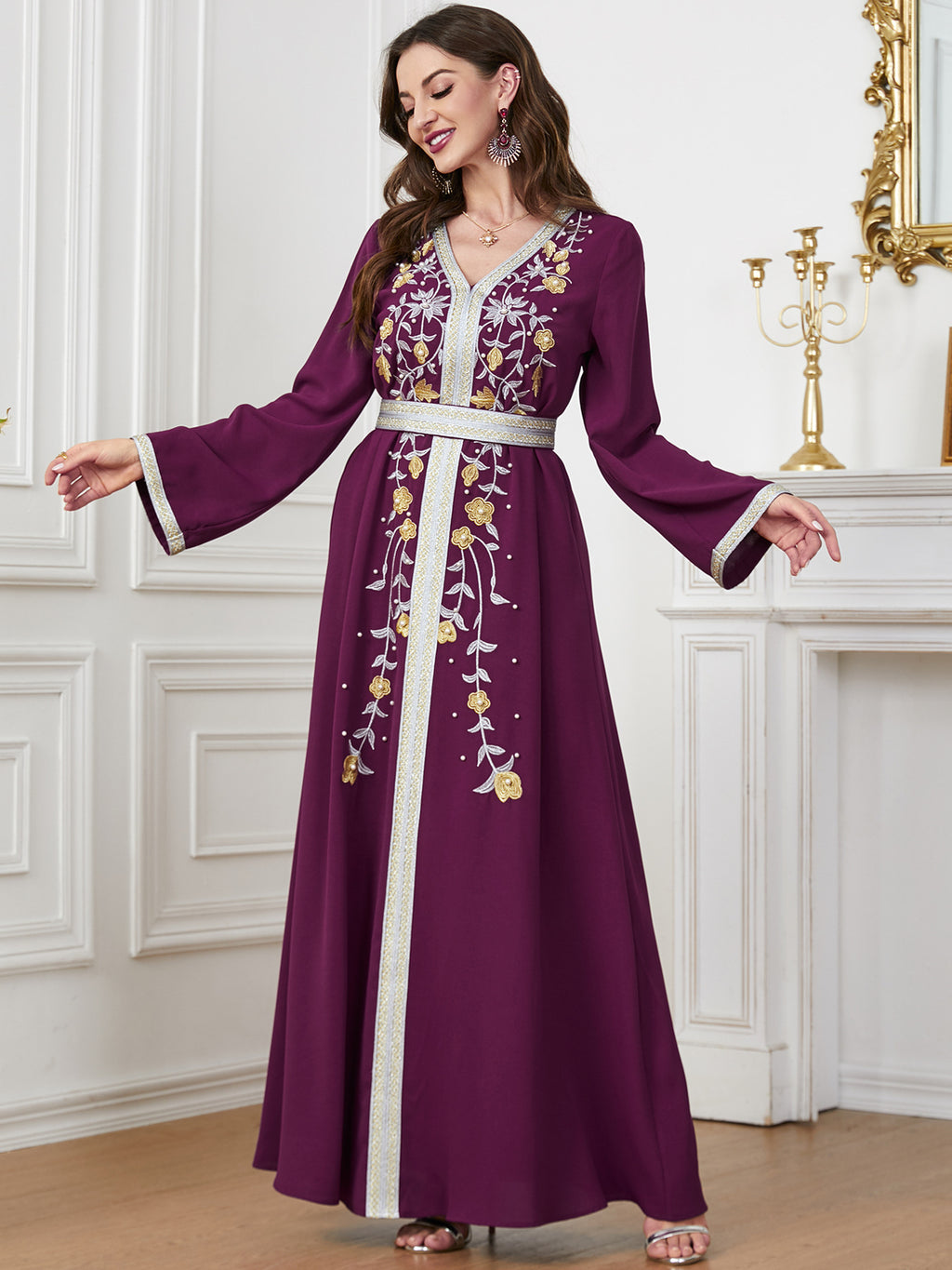 Make a memorable fashion statement with the Women's Long Sleeve Maxi Dress featuring ornate botanical details along the front. It comes in purple, red, blue and green.