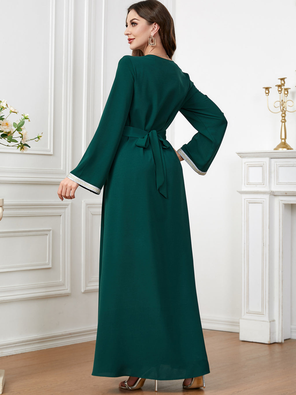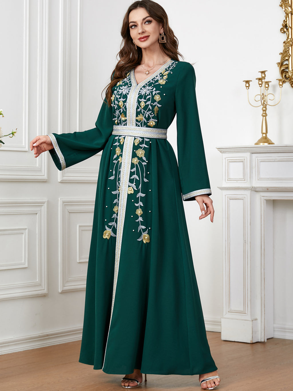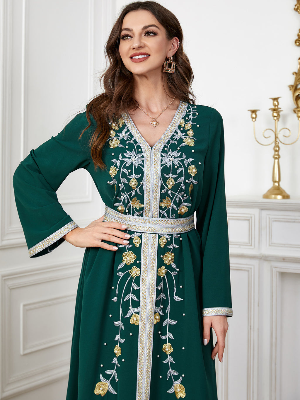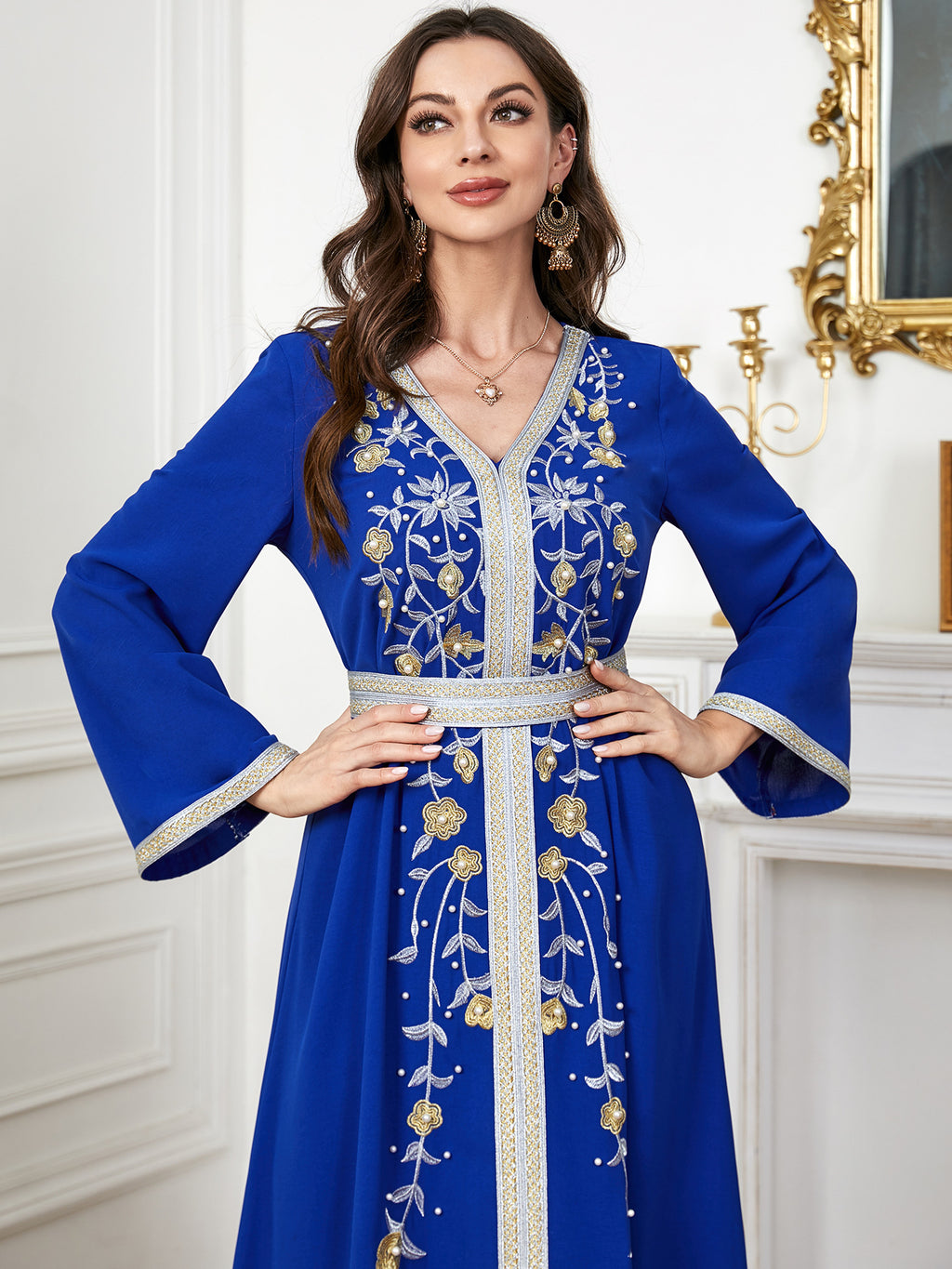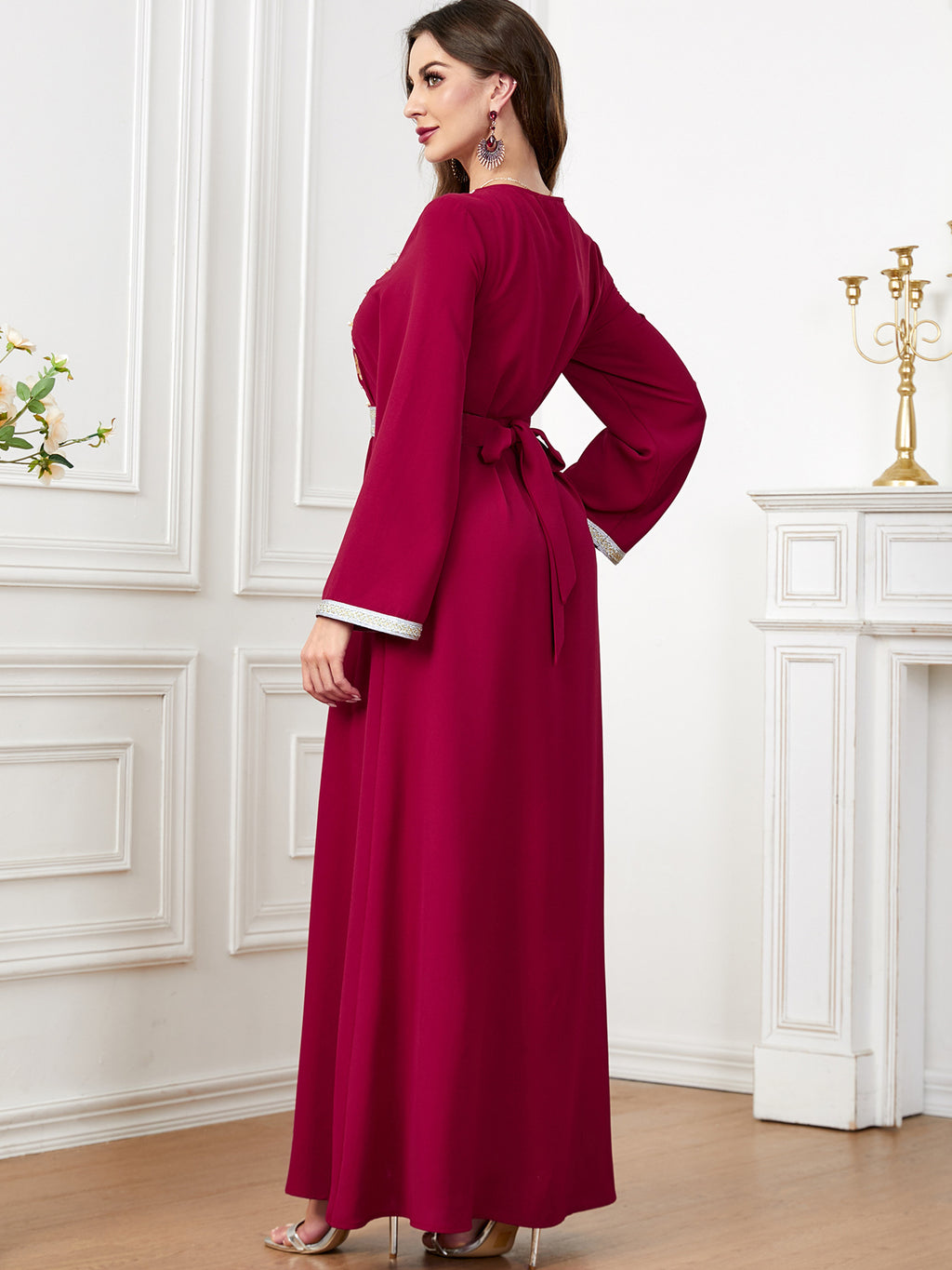 Make a memorable fashion statement with the Women's Long Sleeve Maxi Dress featuring ornate botanical details along the front. It comes in purple, red, blue and green.