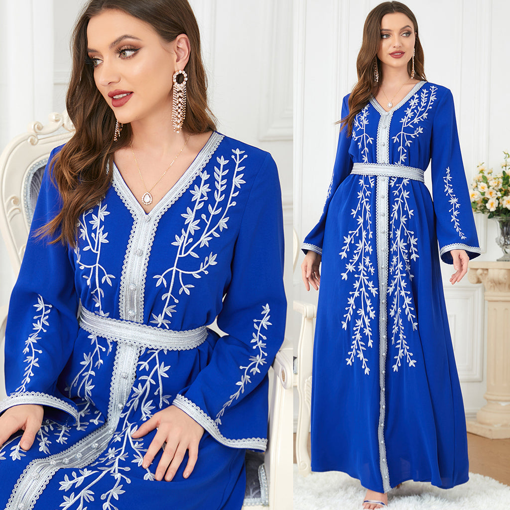 Women's Long Sleeve Silky Blue Maxi Dress with Silvery Details