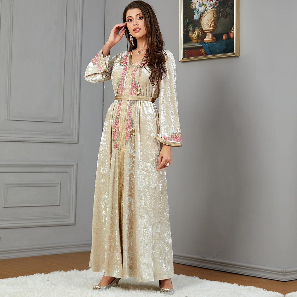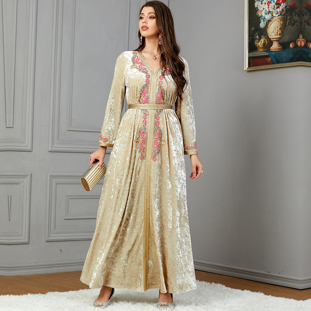 Women's Long Sleeve Velvet Maxi Dress with Gold Trim