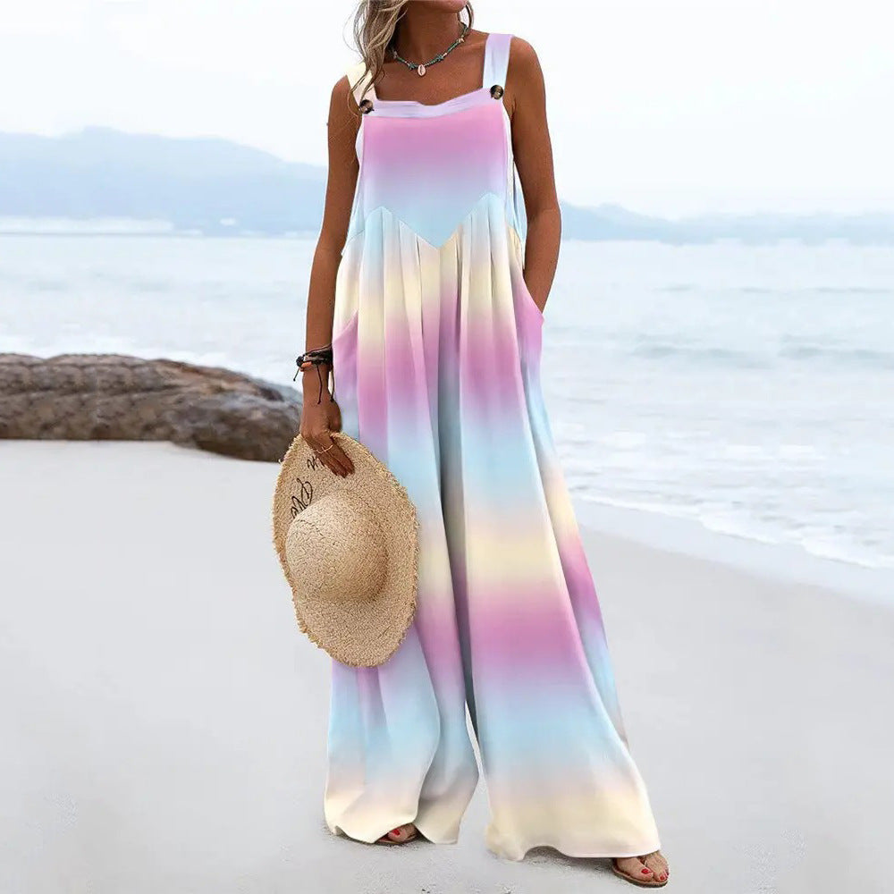 Verleihen Sie Ihrer Sommergarderobe etwas schickes Flair mit diesem ärmellosen Damen-Hosenanzug mit Empire-Taille und weitem Bein. Es ist in verschiedenen Farben und Mustern erhältlich, jedes davon mutig und auffällig.