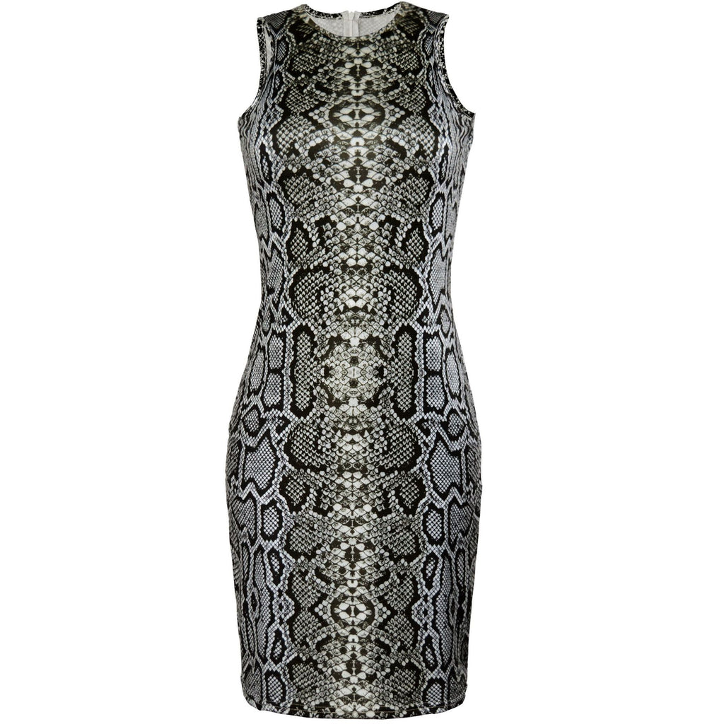 Zeigen Sie Ihre wilde Seite mit der Form der Frauenform, die mit Schlangenhaut in inspiriertem Body Con -Kleid in schwarzem und glänzendem Silber erhältlich ist.