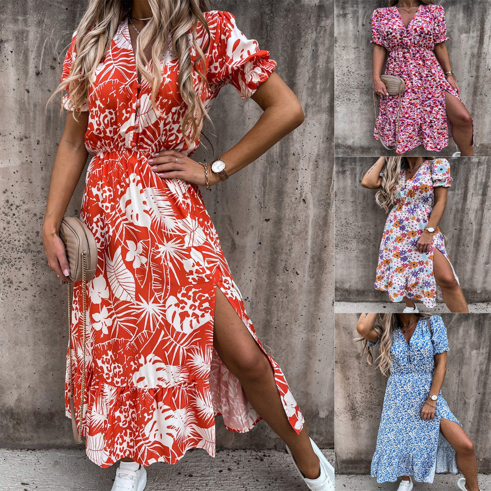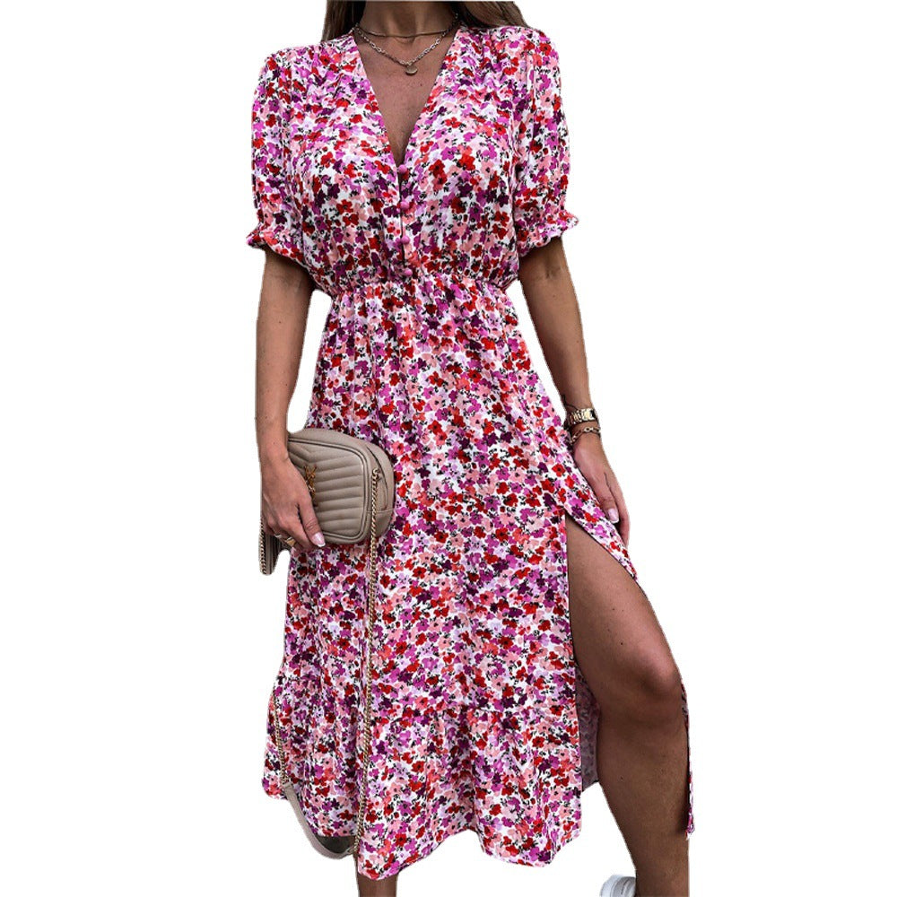 Sehen Sie in diesem Frühling gut aus, wenn Sie das Kurzarm-Midikleid mit V-Ausschnitt und Cinched-Taille für Damen tragen. Dieses farbenfrohe Kleid zeichnet sich durch seinen Blumendruck und die lebhaften Farboptionen aus.