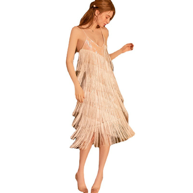 Legen Sie einen Hauch von Laune in Ihre Ensembles mit dem Quasten -Midi -Kleid im Frauenflapper -Stil, das durch viele Quasten gekennzeichnet ist, die die Schichten erzeugen. Es kommt in drei Farben.