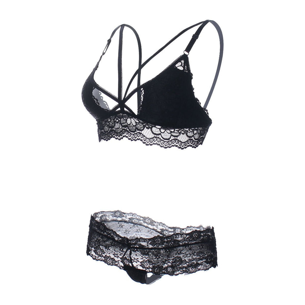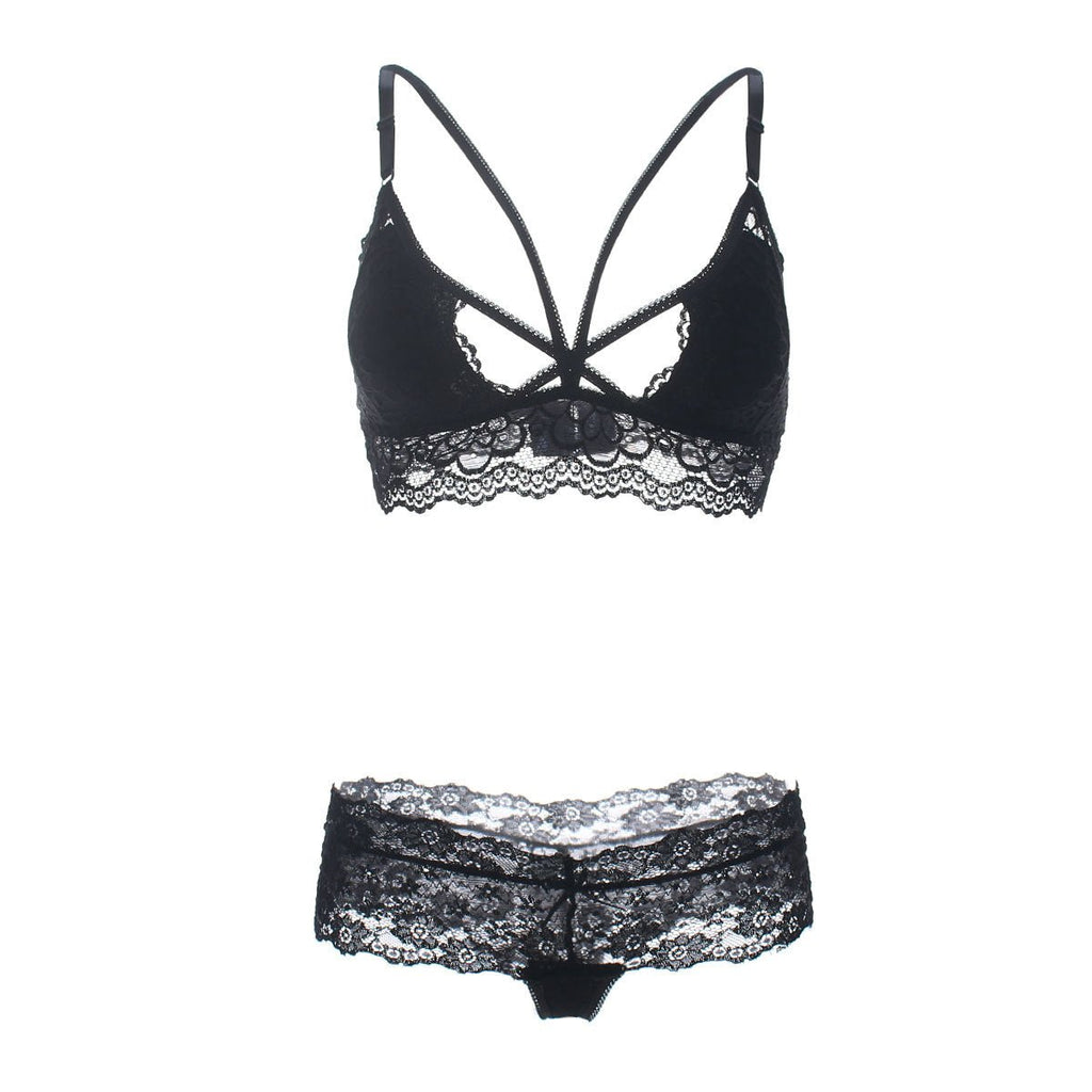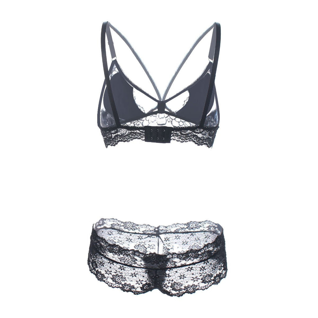 Llama la atención sobre todas tus curvas con el conjunto de bra y panty de encaje con tiras de jaula. El conjunto presenta una blusa de tiras con una banda de encaje y pantalones cortos de encaje a juego.
