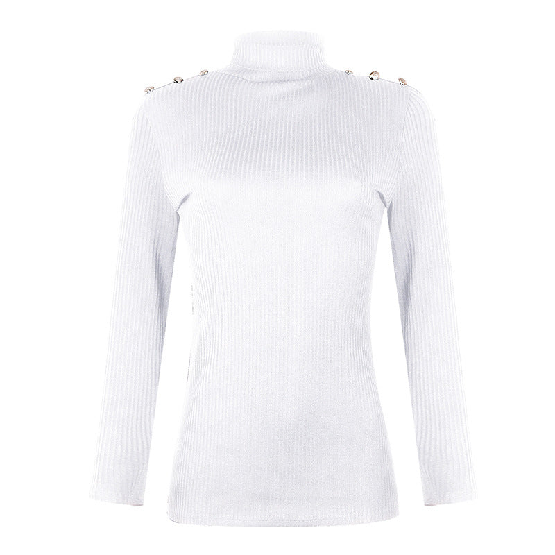 Destácate del resto este invierno y otoño con el suéter de cuello alto de manga larga para mujer con joyas. Llama la atención gracias a las grandes joyas redondas que se encuentran tanto en los hombros como en las mangas.