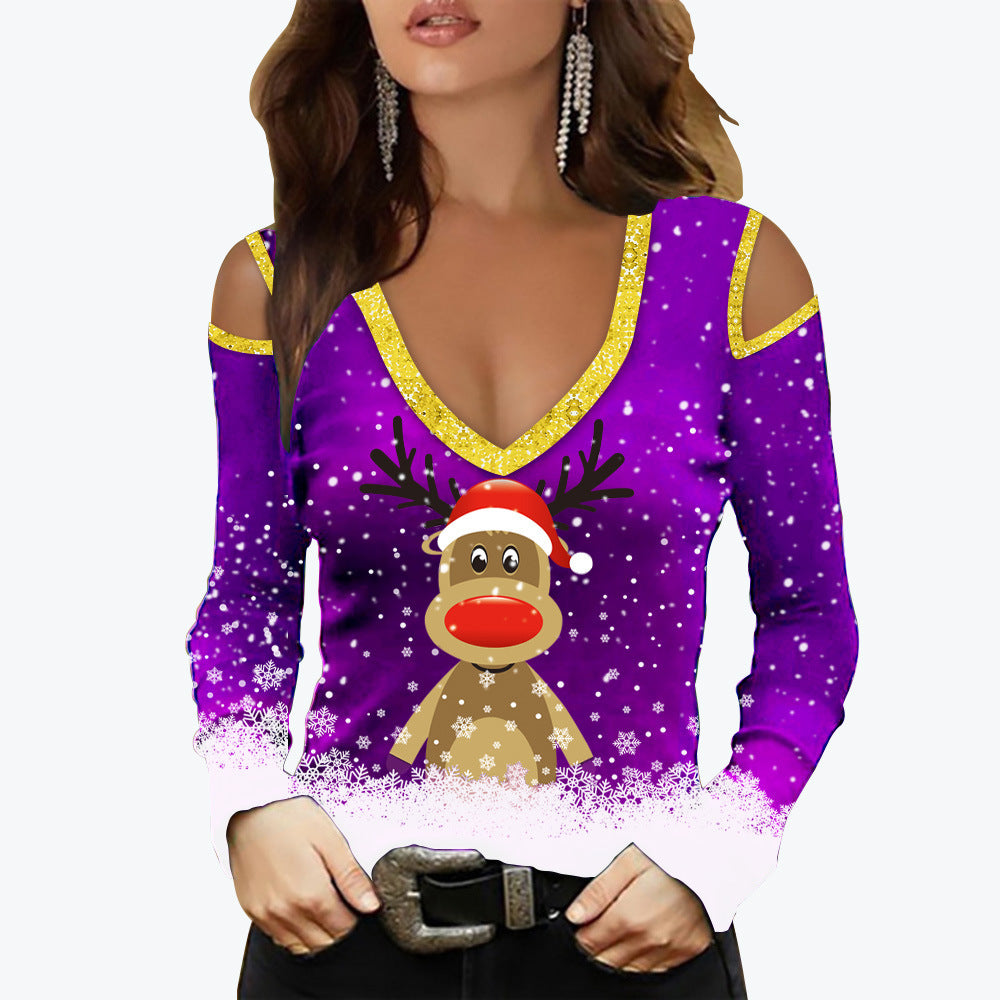 Celebre las fiestas con un estilo peculiar este año con el suéter Festive Christmas Reindeer Cold Shoulder. Con un escote en V bajo, aberturas a lo largo de los hombros y un gráfico de reno, esta camiseta es realmente única.