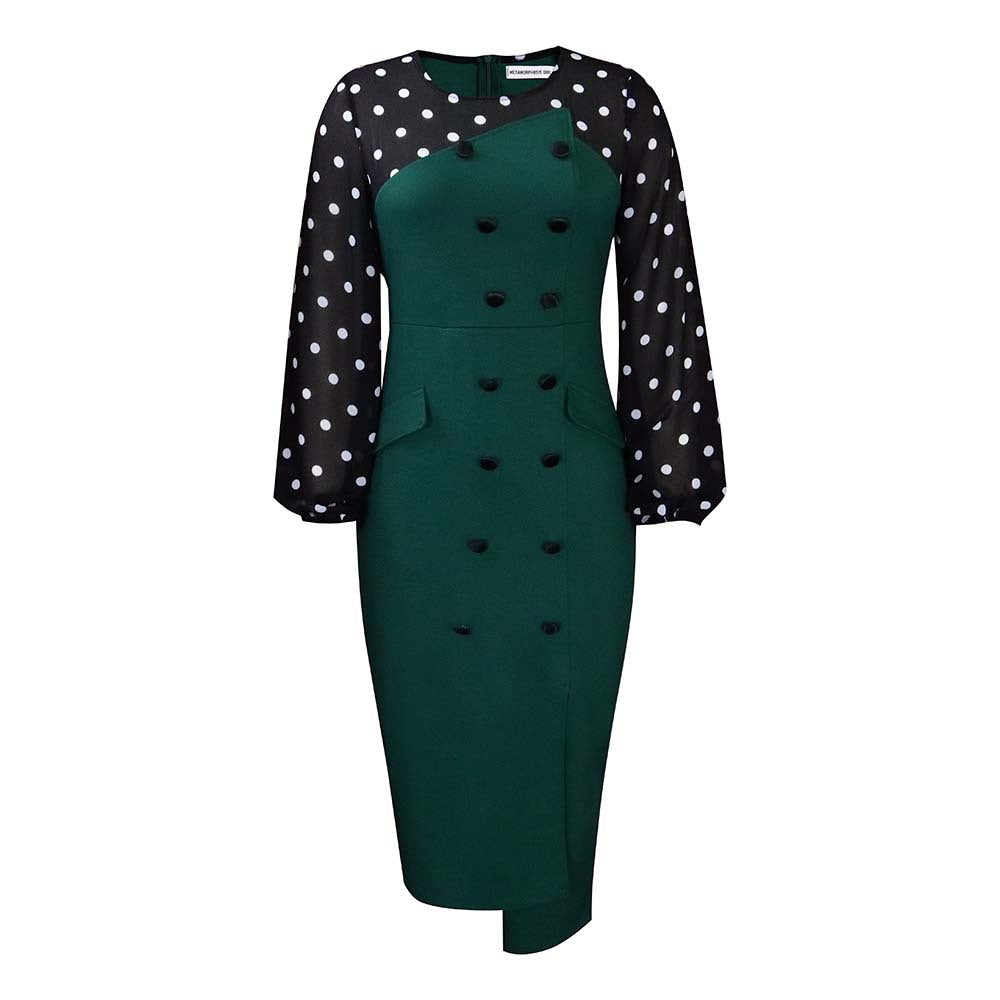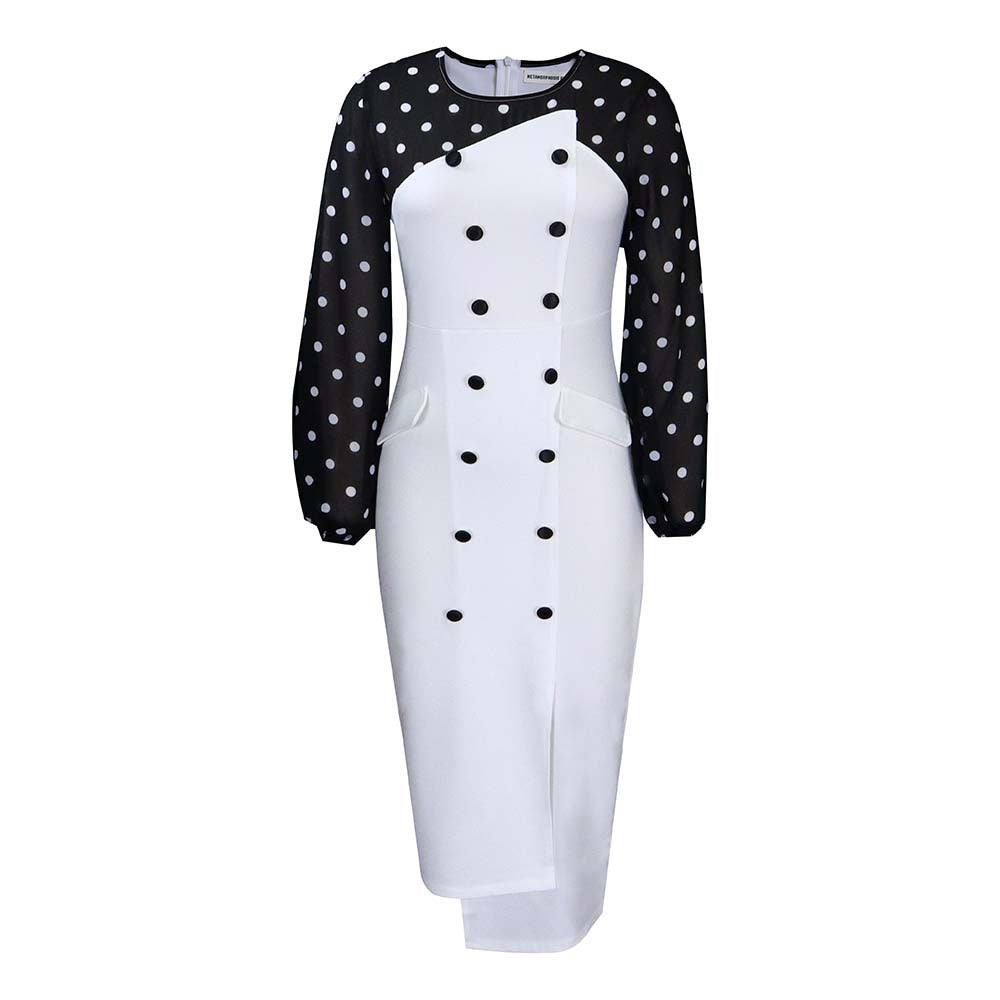 Transforme su ropa de trabajo eligiendo el vestido de lápiz con botones y lunares para mujer. Este vestido midi presenta una falda de lápiz de color sólido con botones de acento, así como una blusa de lunares de manga larga.