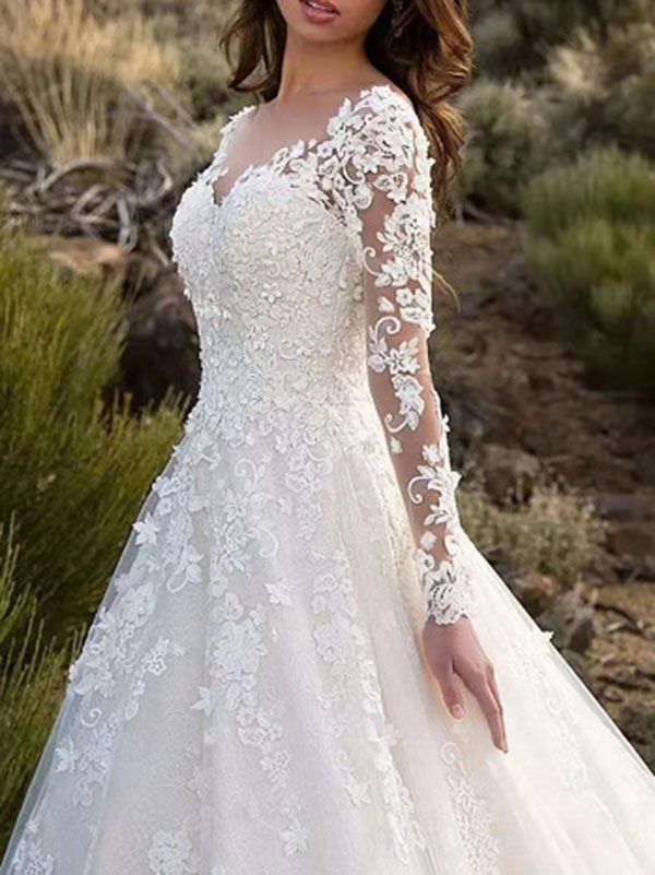 Luce hermosa en el baile o el día de tu boda con el vestido largo de princesa para mujer con mangas largas de encaje semitransparente y escote corazón. Es de color blanco y presenta fabulosos detalles de encaje.