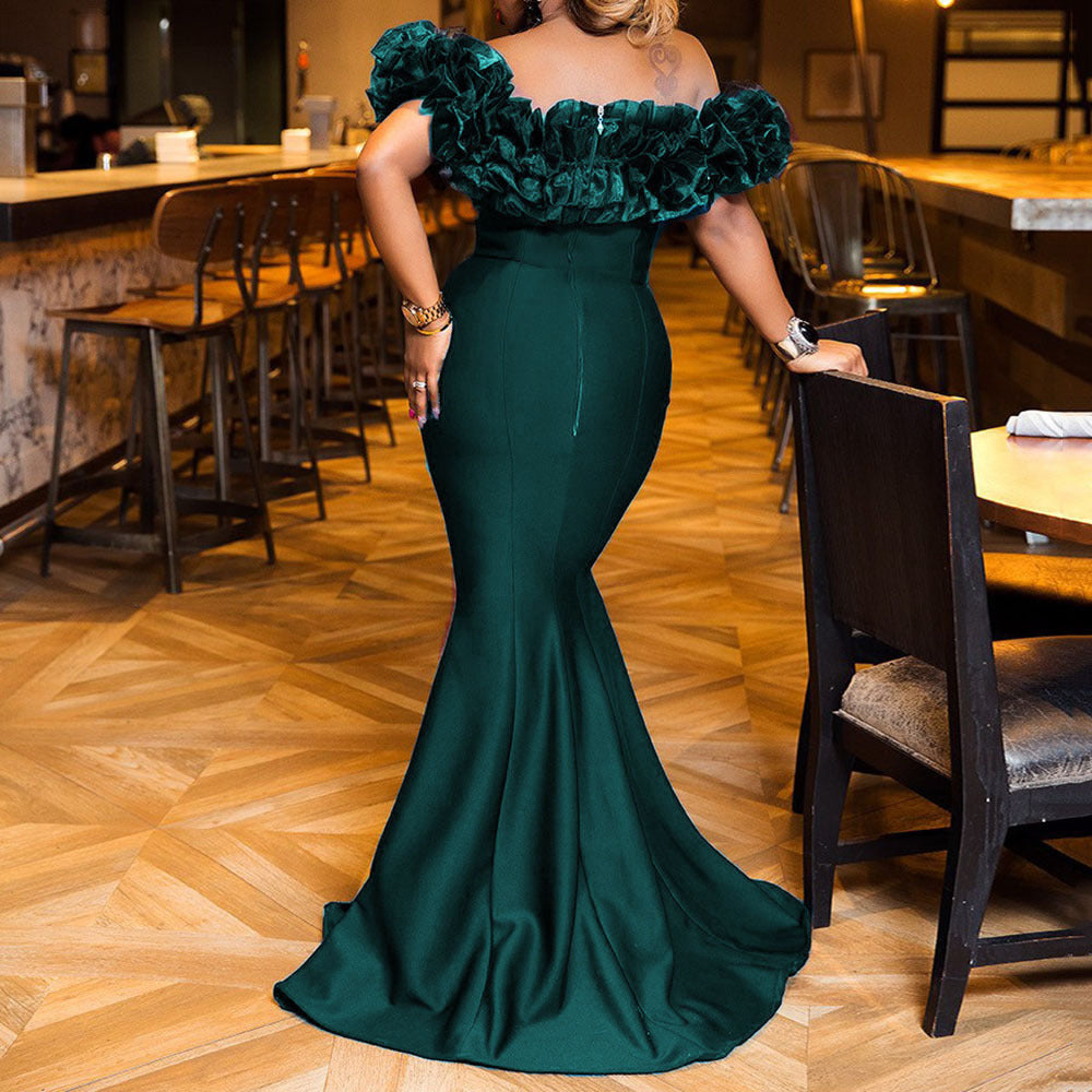 Consigue un estilo vintage elegante cuando te vistas con el vestido de sirena ajustado con hombros descubiertos y escote con volantes para mujer que presenta una elegante falda de sirena que desciende desde la tela ajustada a lo largo de los muslos.