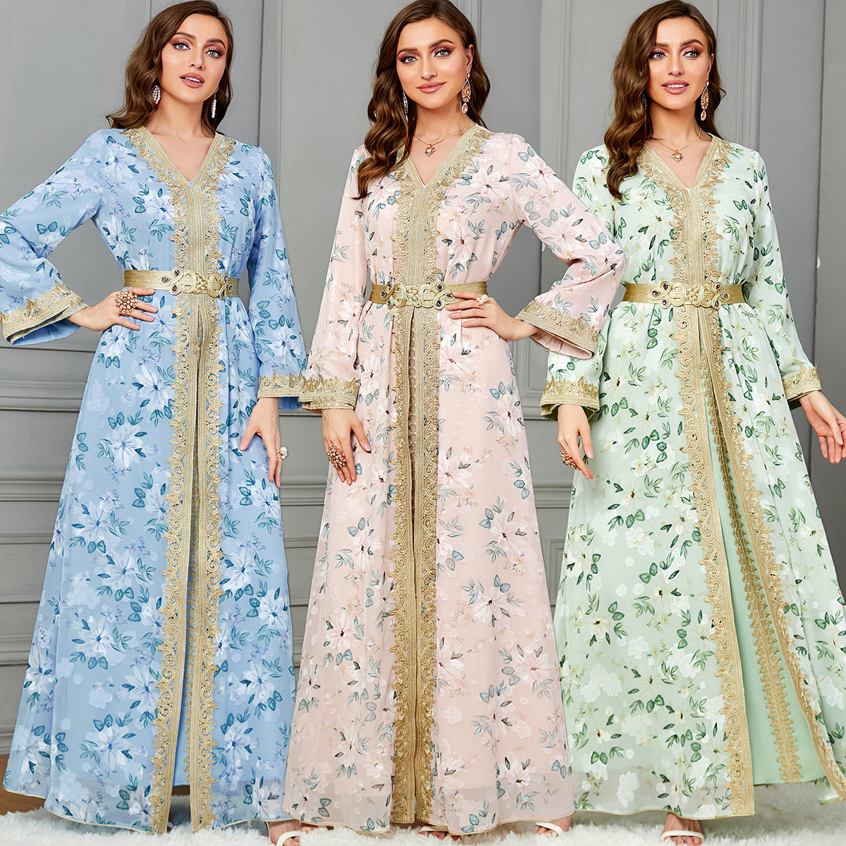THEONE APPAREL Women's Pastel Floral Print Maxi Dress with Gold Trim