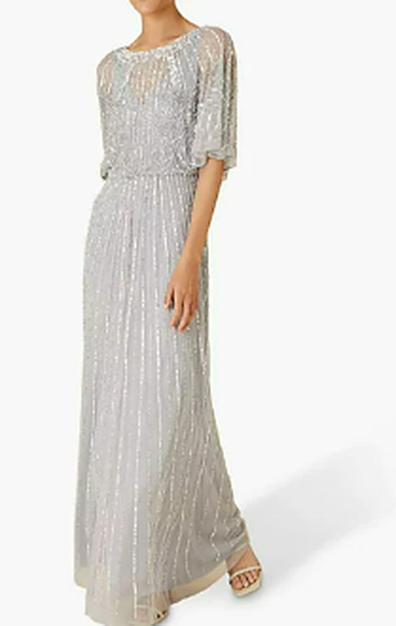 Cette longue robe maxi pour femmes avec des manches découpées et un corsage ajusté en vrac est une jolie robe semi-casuelle pour toute occasion. La robe pleine longueur est fluide et dispose d'un tissu soyeux.