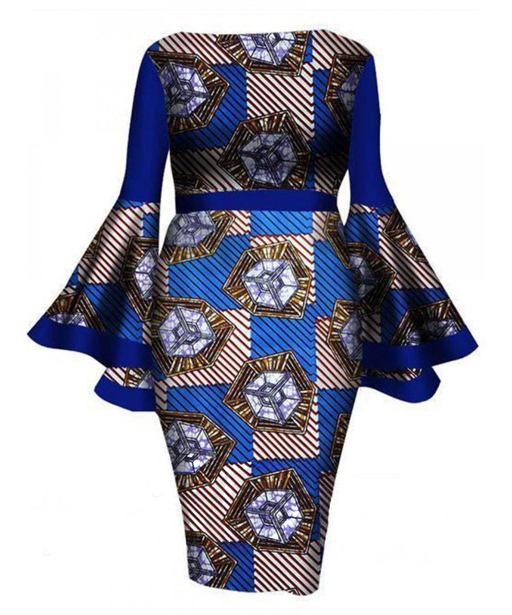 Flaschez votre silhouette et ajoutez Flair à votre look dans cette robe de cou à manches volontaires à motifs audacieuses avec des manches de cloche et un corps ajusté.