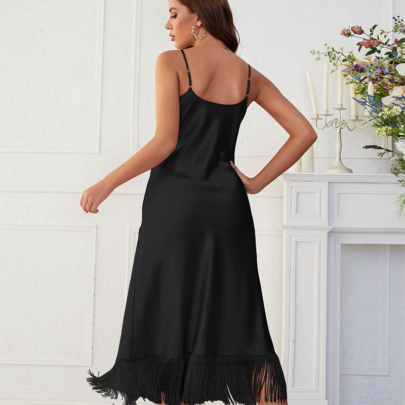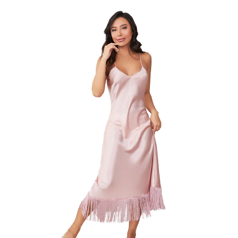Cette robe de longueur midi pour femmes avec des glands sur l'ourlet est une chemise de nuit mignonne et chic pour n'importe quelle nuit et est disponible en options de couleur rose vif, rose bébé ou noir.