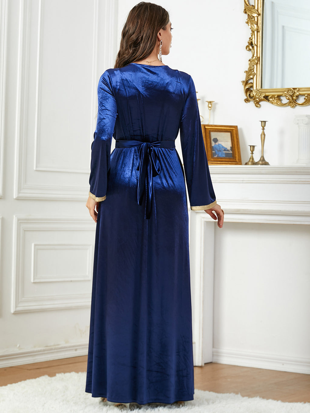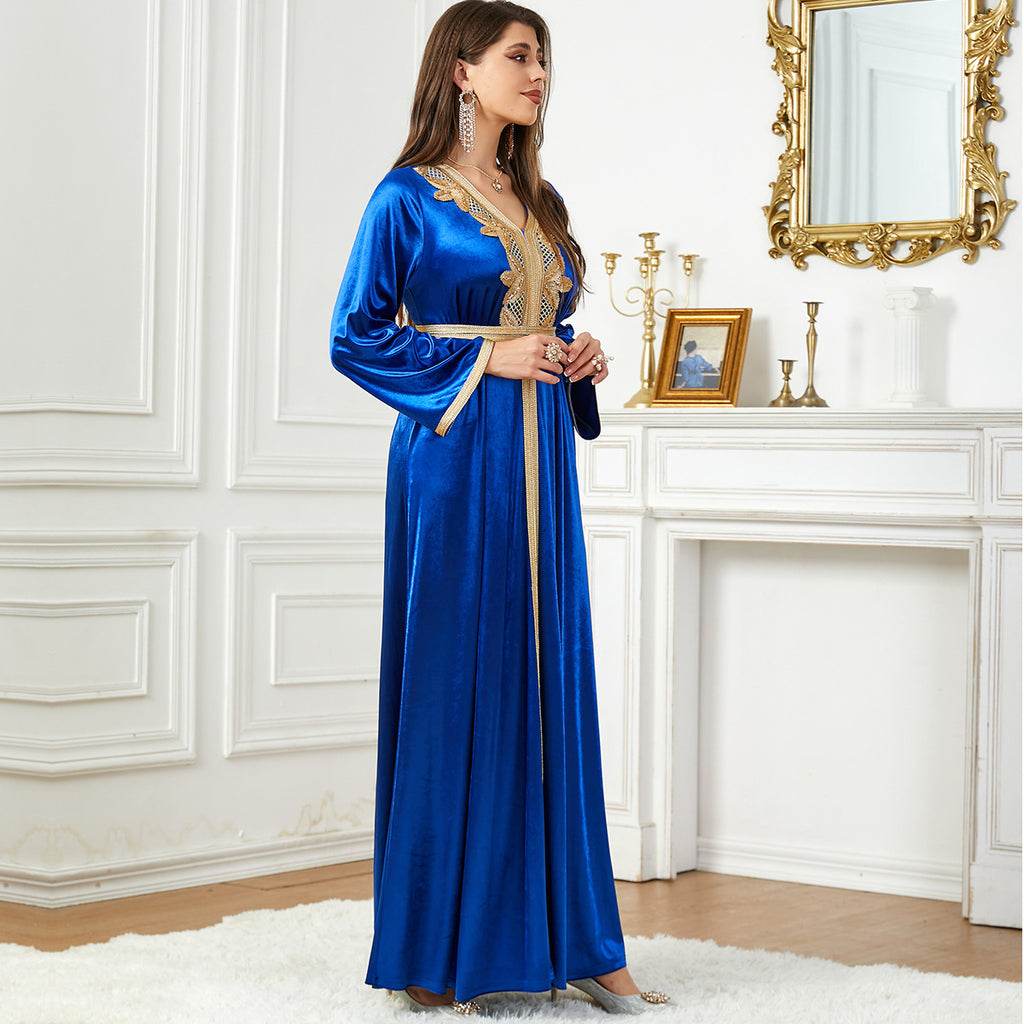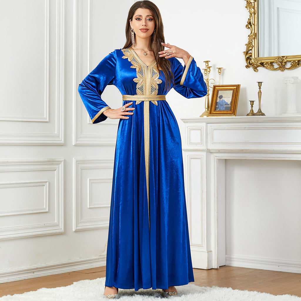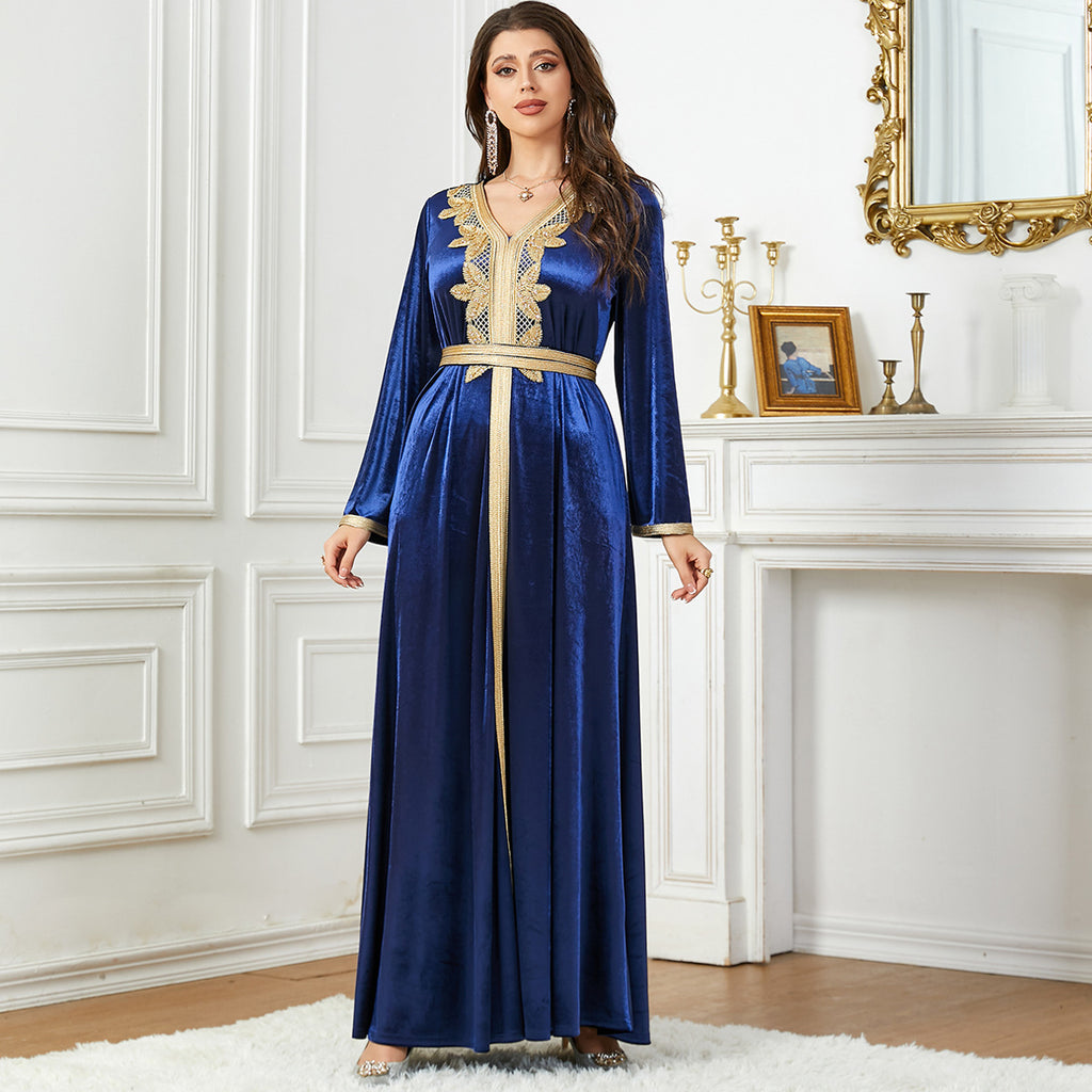 Whether you choose the light blue color, the dark blue or purple, the Women's Long Sleeve Velvety Dress with Golden Details is sure to flatter you.