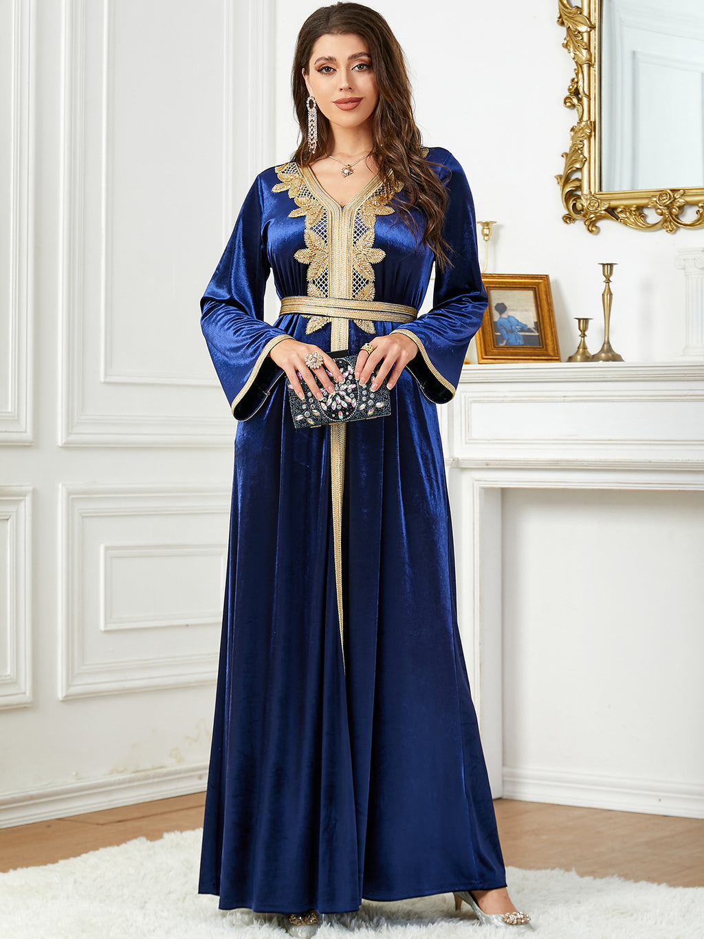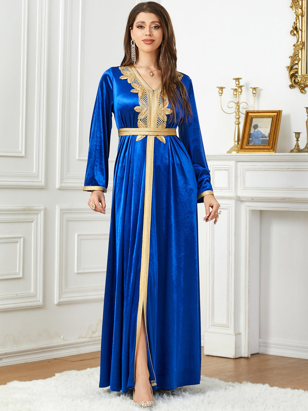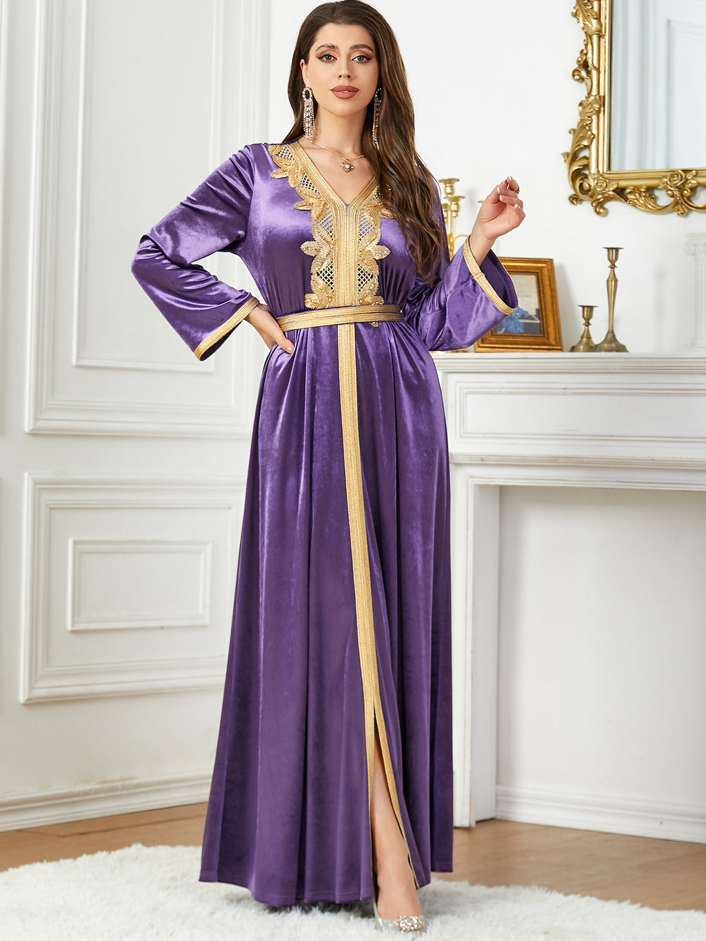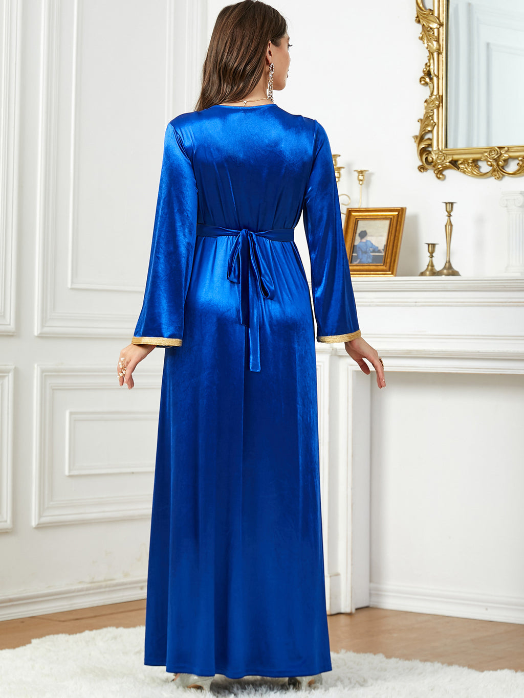 Whether you choose the light blue color, the dark blue or purple, the Women's Long Sleeve Velvety Dress with Golden Details is sure to flatter you.