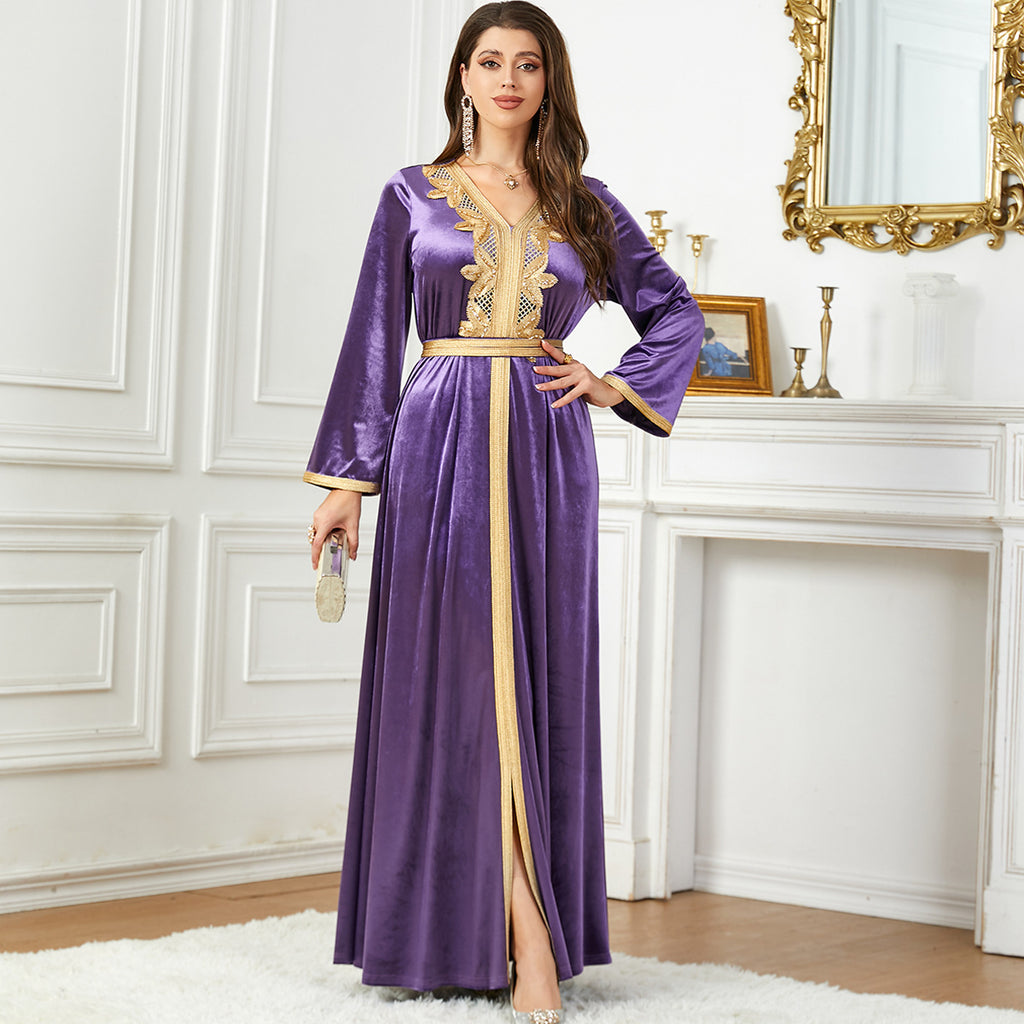 Women's Long Sleeve Velvety Dress with Golden Details