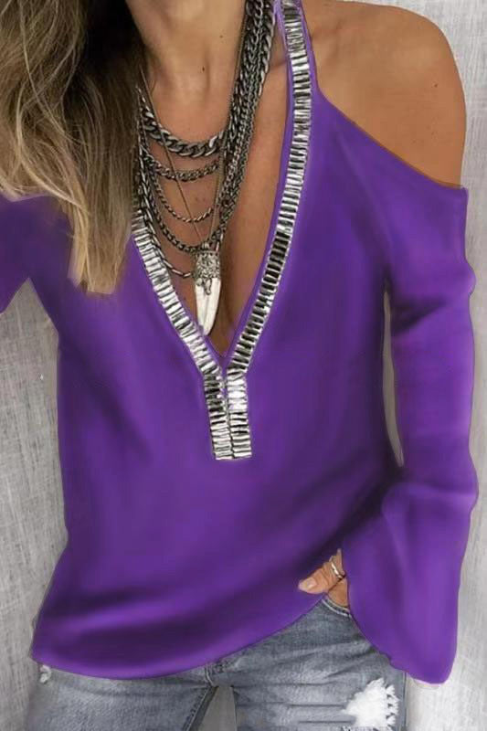 मेटालिक सेक्विन ने कम वी-नेक कोल्ड शोल्डर टॉप को लाइन किया