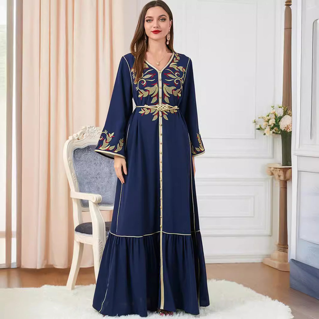 Step out for dinner in style wearing the sophisticated Women's Navy Blue Long Sleeve Maxi Gown complete with intricate gold and red detailing.