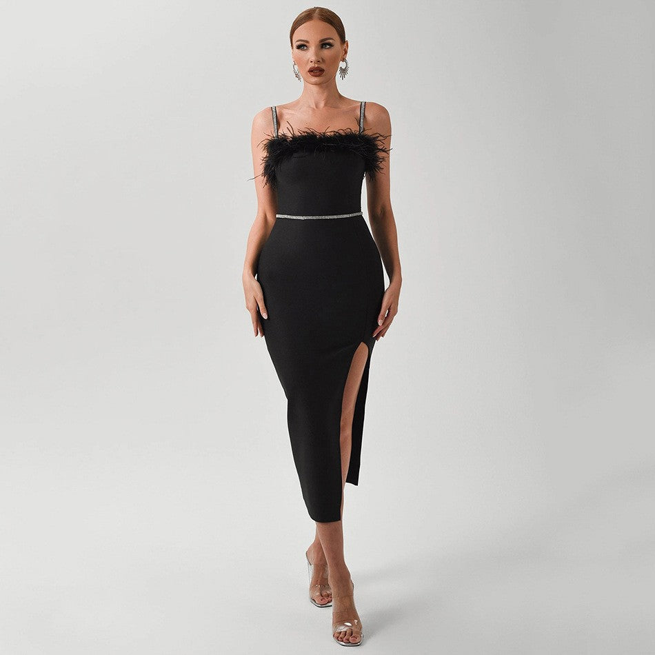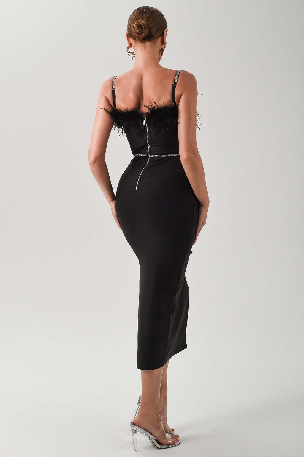 Pamerkan sisi genit Anda dengan gaun midi yang pas dari wanita. Gaun ini menampilkan tali spaghetti yang cocok dengan kain yang menutupi pinggang untuk memberikan bentuk pakaian.