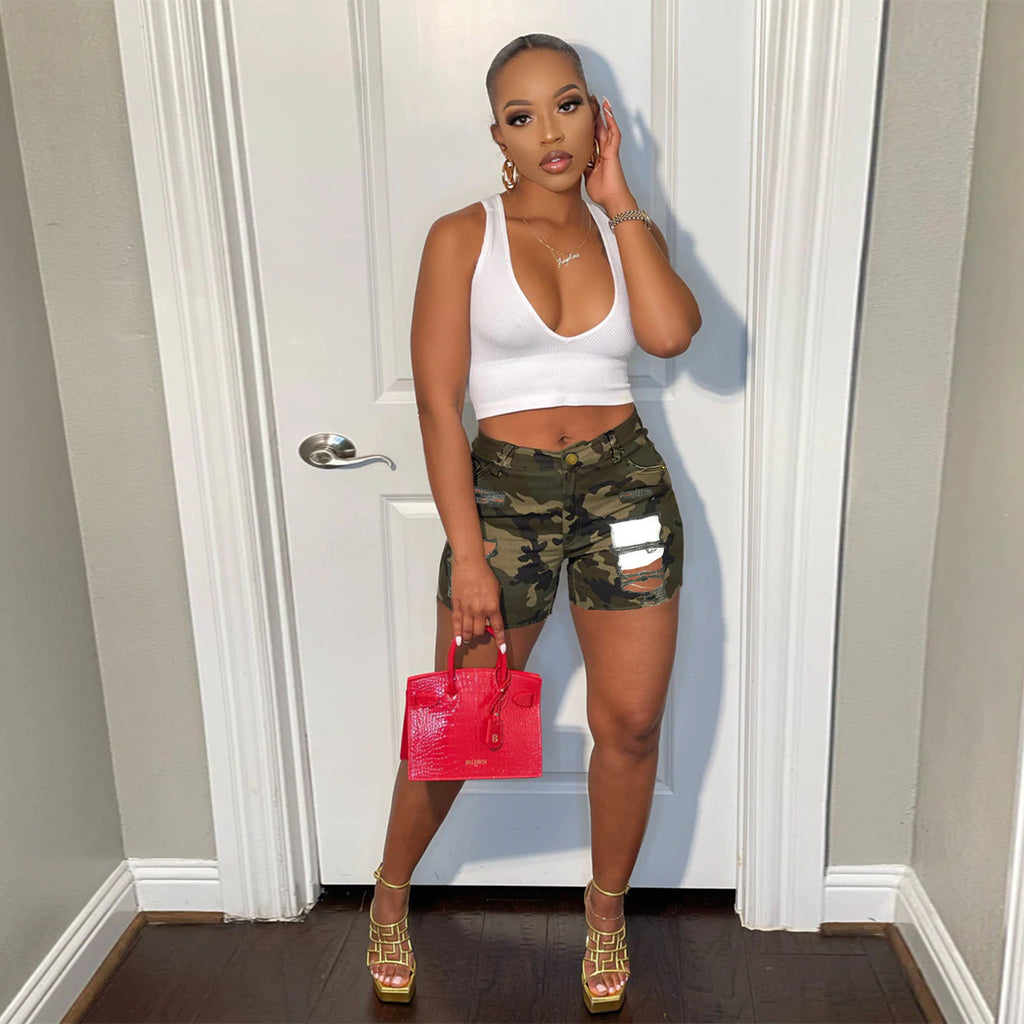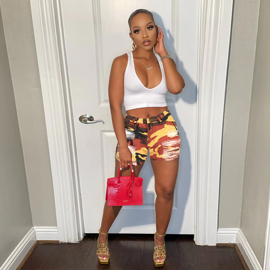 Celana pendek robek pinggang tinggi wanita di camo cetak