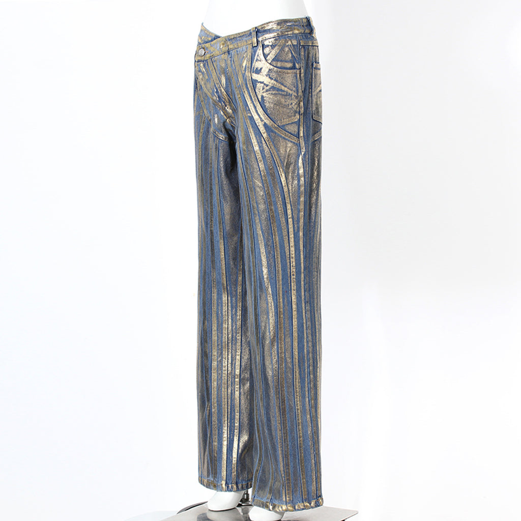 Jeans buckle miring berlapis emas dengan detail sikat perak