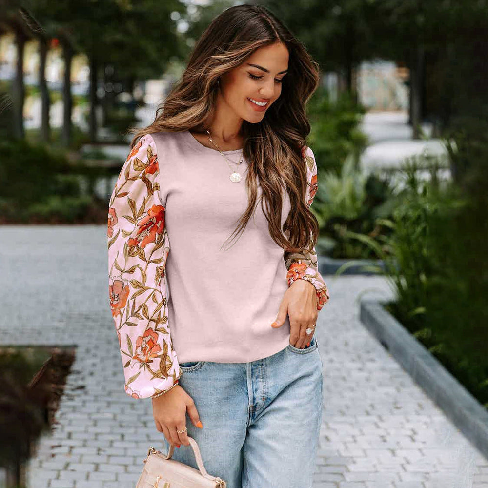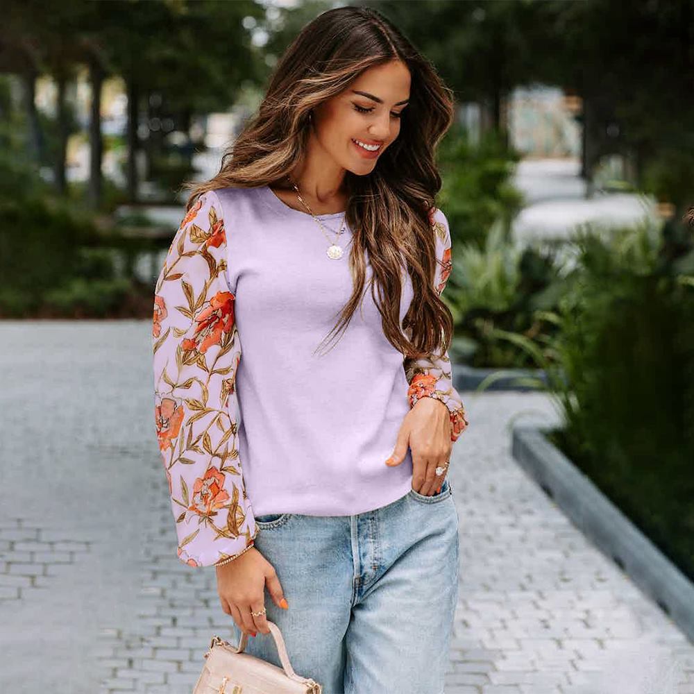 Dapatkan tampilan pola bunga dengan kemeja lengan panjang wanita dengan lengan longgar bunga. Kemeja itu menonjol dengan warna solid mereka hanya beraksen oleh detail di lengan panjang.