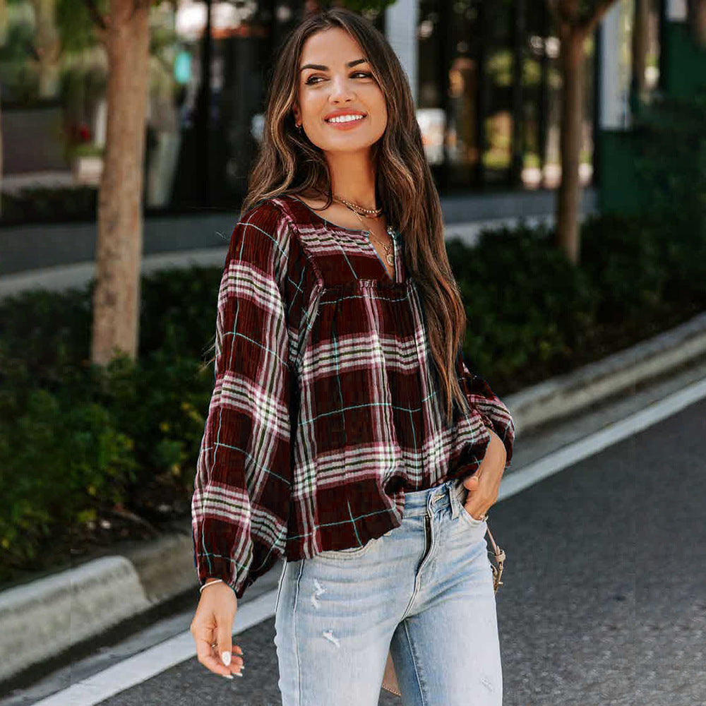 Kemeja lengan panjang kotak-kotak hangat dengan v-neck