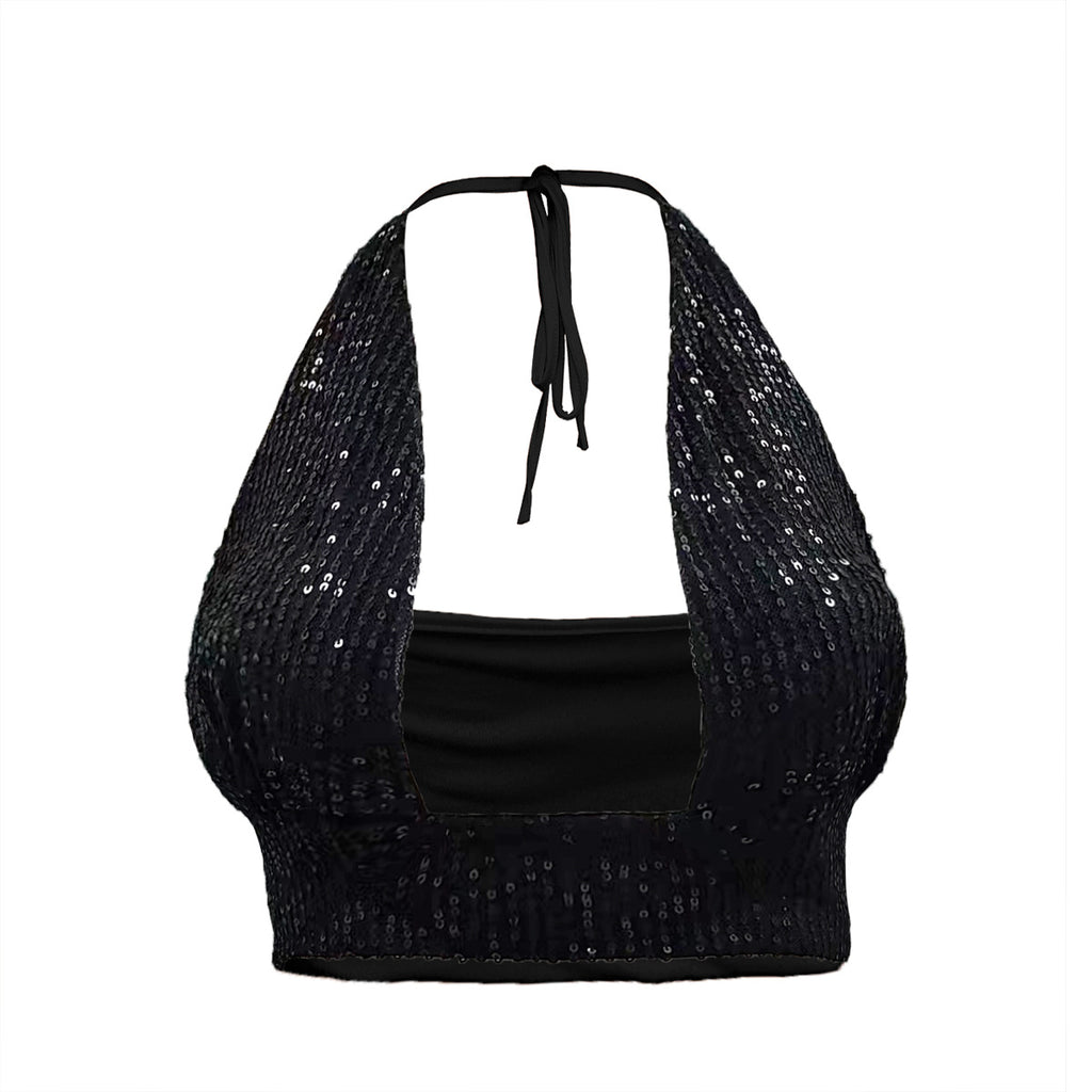 Top crop halter tanpa lengan wanita dengan payet