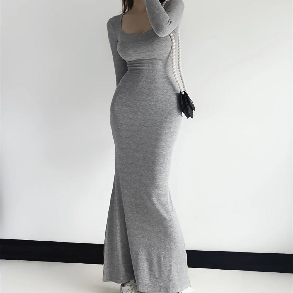 Show off your figure in the simple yet chic Women's Long Sleeve Form Fitting Maxi Dress with Scoop Neck. This dress comes available in neutral black and light gray options.
