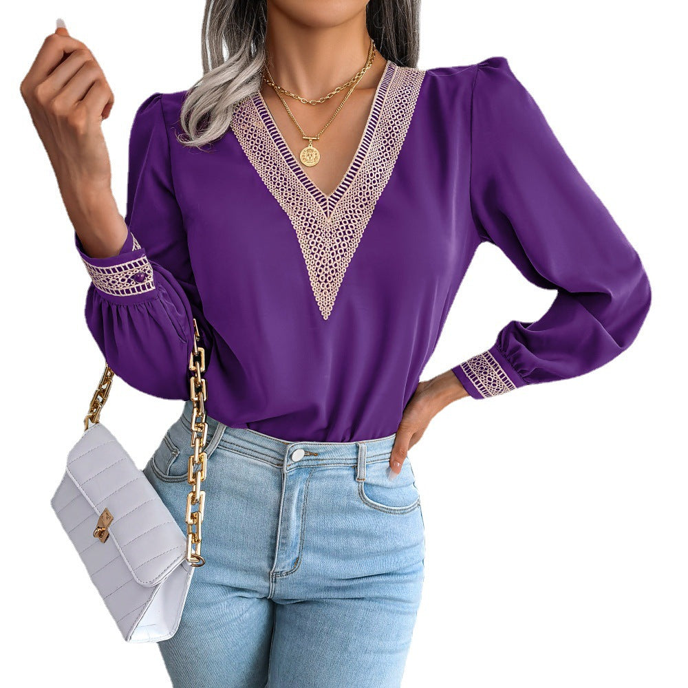 Aggiorna i tuoi gruppi casuali con la camicetta a maniche lunghe a V delle donne con un design a colori solidi con un bordo a maglia accento lungo il scollo a V della parte superiore. È disponibile in cinque diverse opzioni di colore.