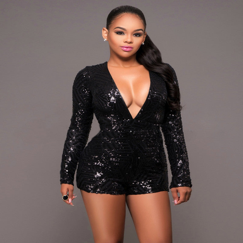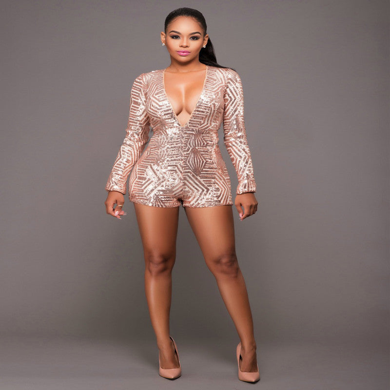 Fai una dichiarazione ovunque tu vada quando indossi la tuta da corpo a forma di donna con maniche lunghe. Presenta un scollo a V basso e un motivo geometrico luccicante.