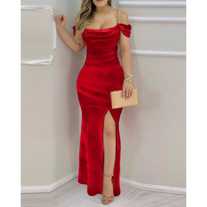 低いネックラインと軽薄な太ももが片側にスリットを備えた肩のマキシドレスに合った女性の形で曲線を披露します。