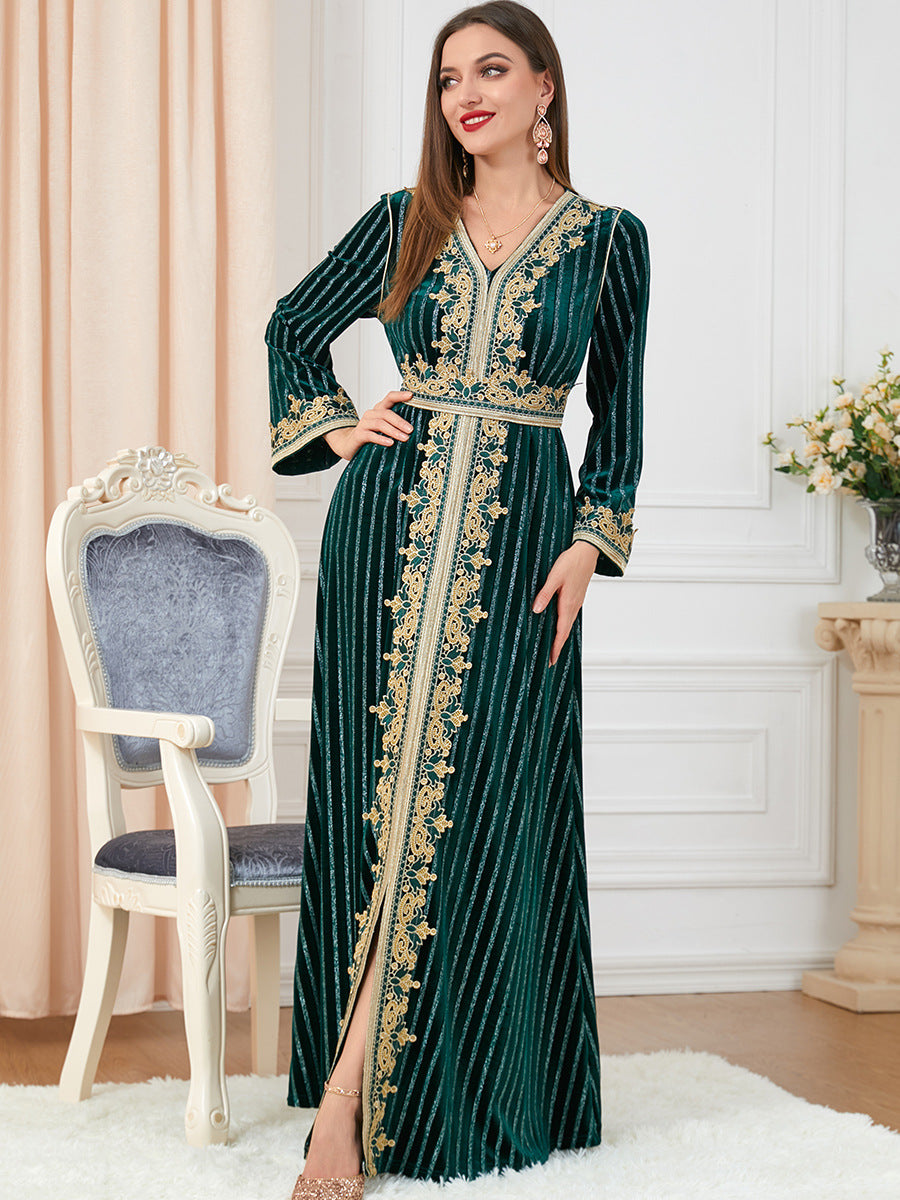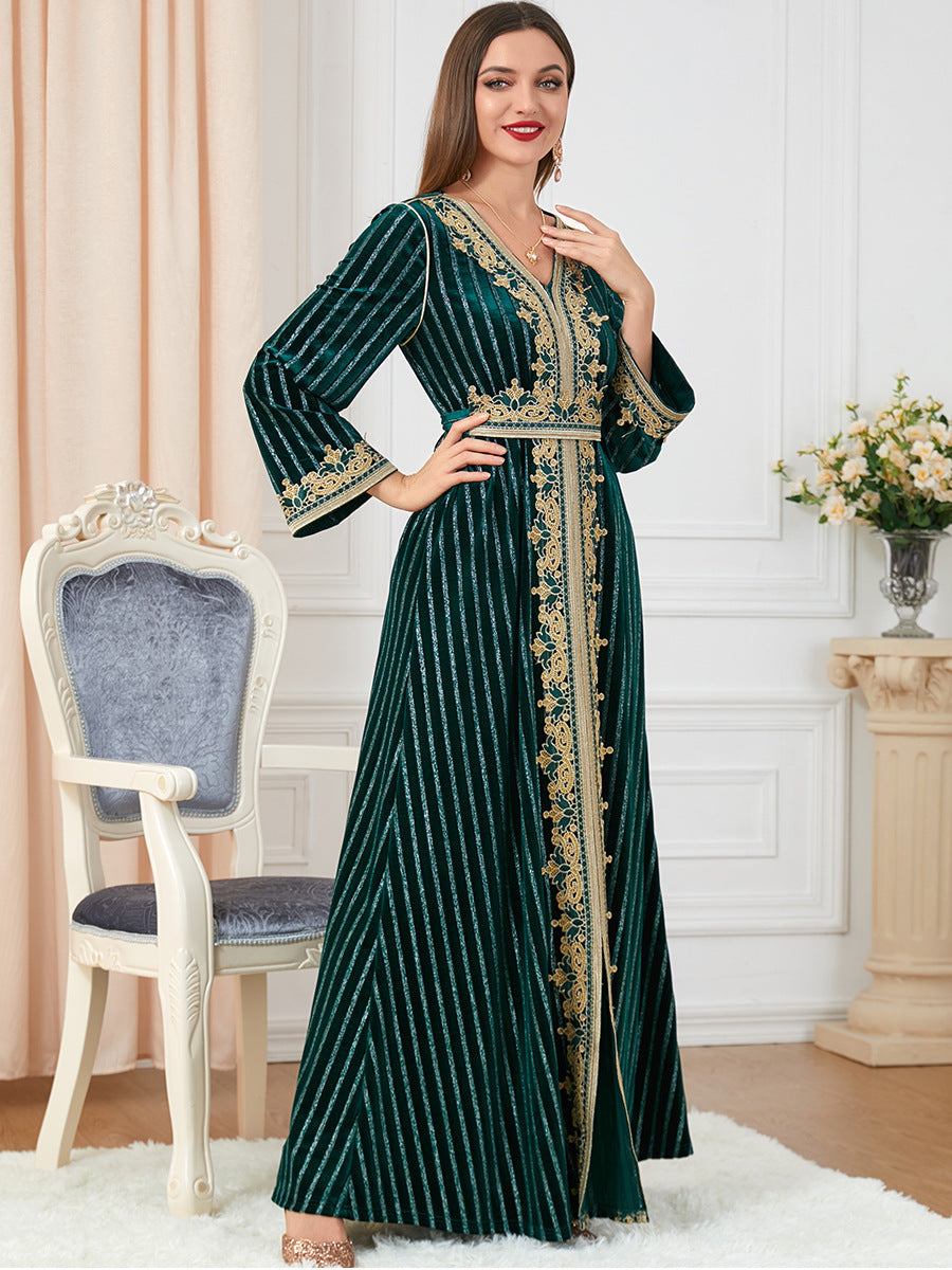 Express yourself in the Women's Long Sleeve Vertical Stripe Green Maxi Dress. It features golden-toned accents that match the trim on the sleeves.