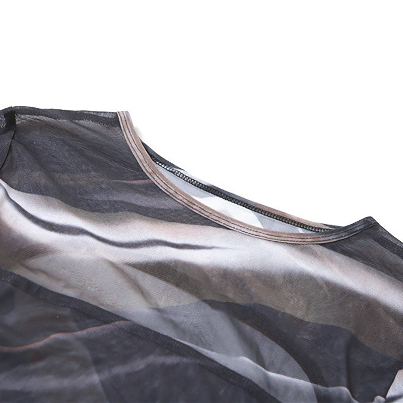 Inspired by natural marbling, this Women's Long Sleeve Semi Sheer Crop Top features streaks of neutral light and dark grays with hints of pale blue and cream balancing it out.