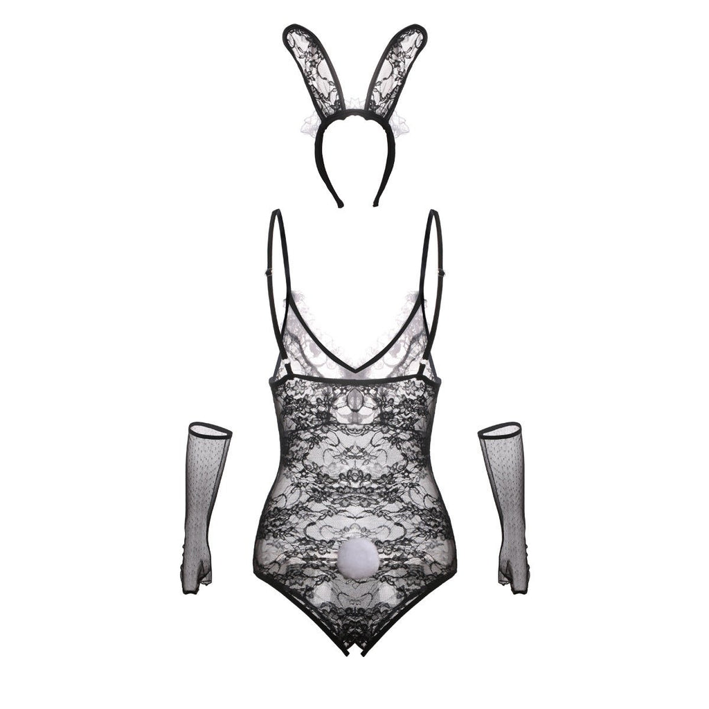 Speel de Playboy -fantasieën van je geliefde uit als je dit konijnfoofoo -kant -lingerie -kostuum van Bunny Foofoo tegengaat, compleet met konijnenoren en gaashandschoenen.