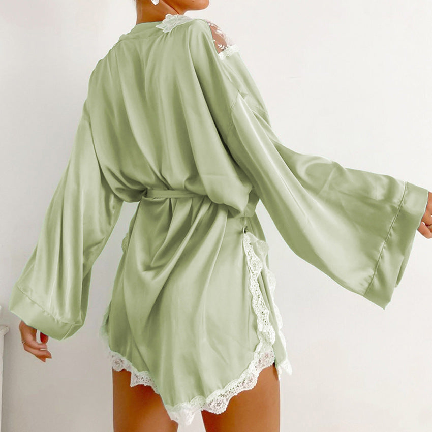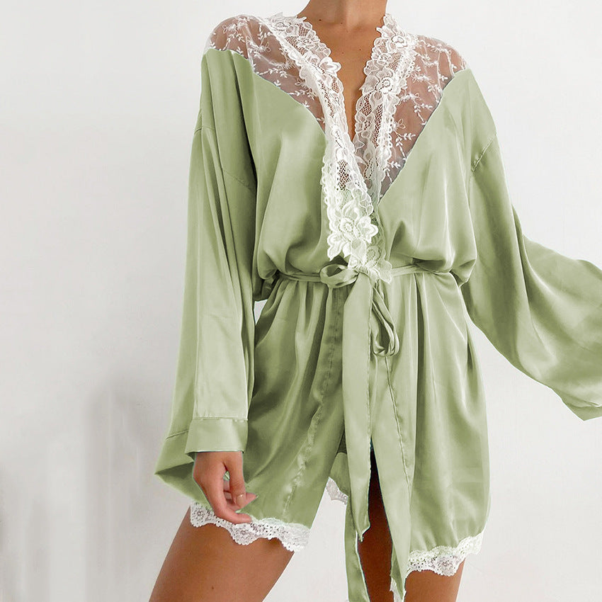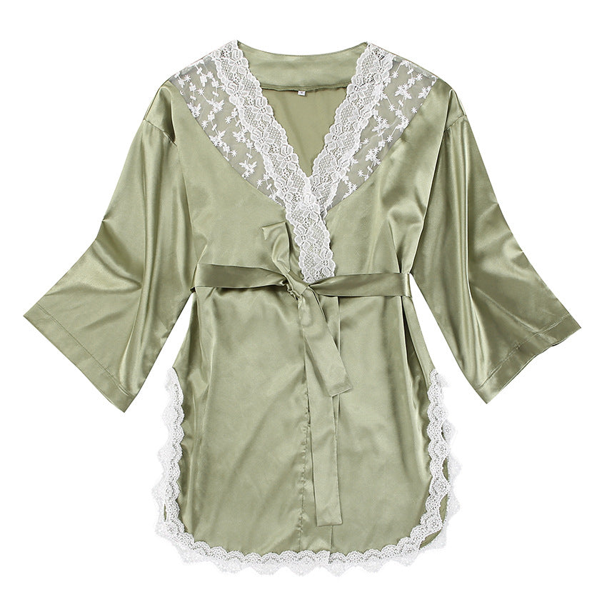 Het Lacy Silky Silky Lose Sleeve -mouw voor vrouwen is een verleidelijk gewaad voor nacht- of ochtendkleding. Het beschikt over een kanten rand langs de zoom en schouders en komt in een zacht lichtgroen.