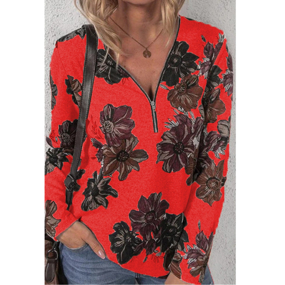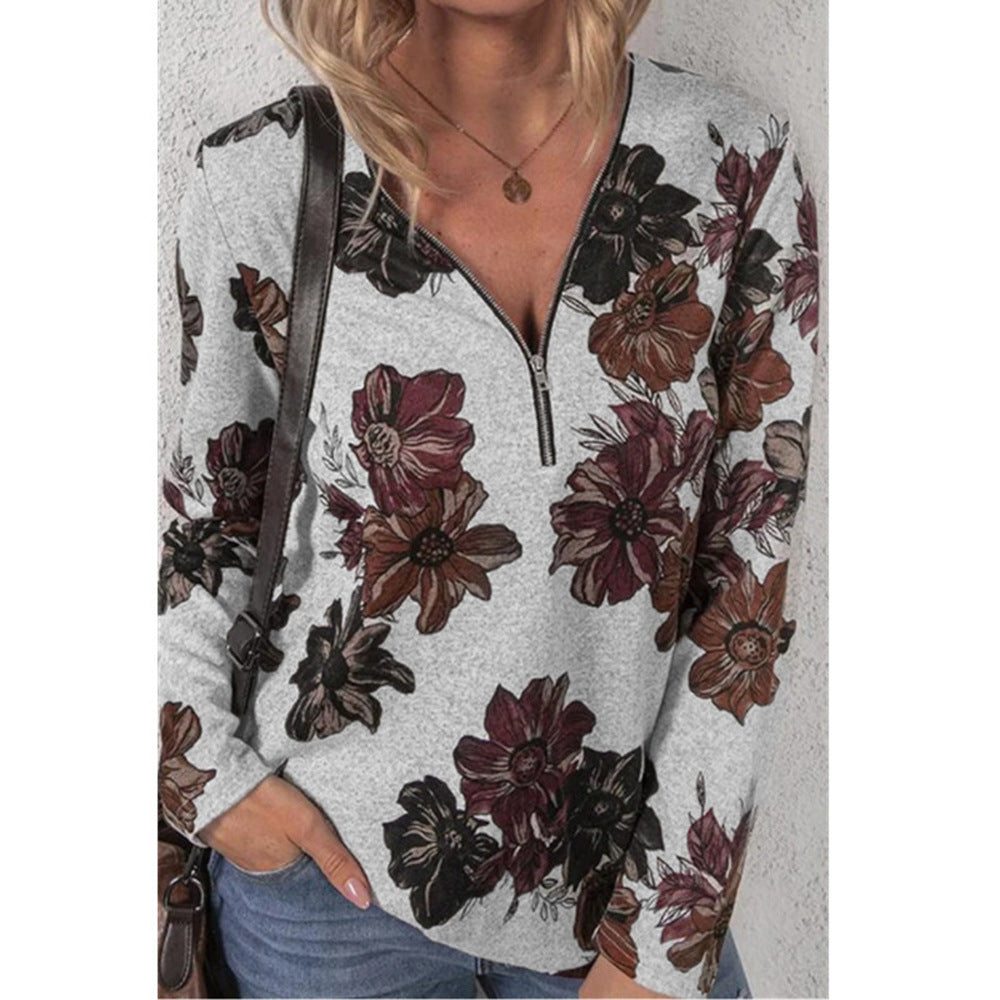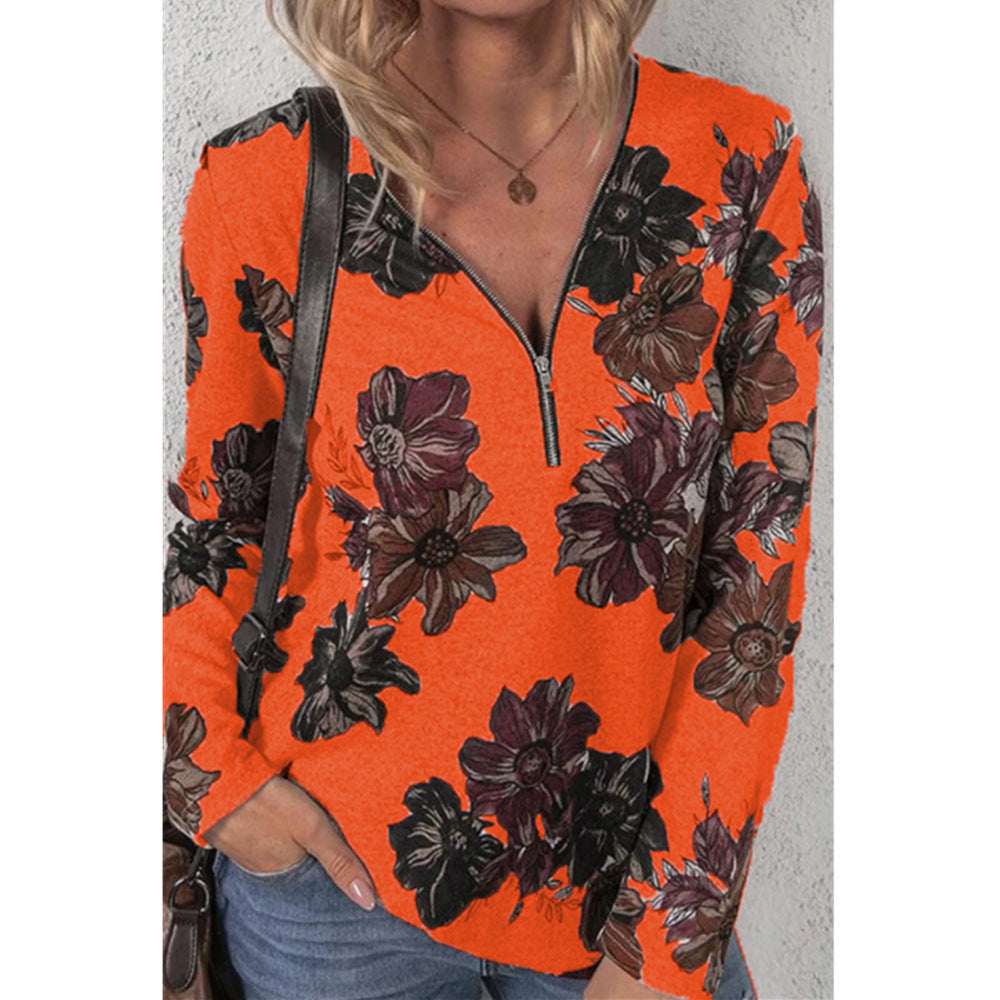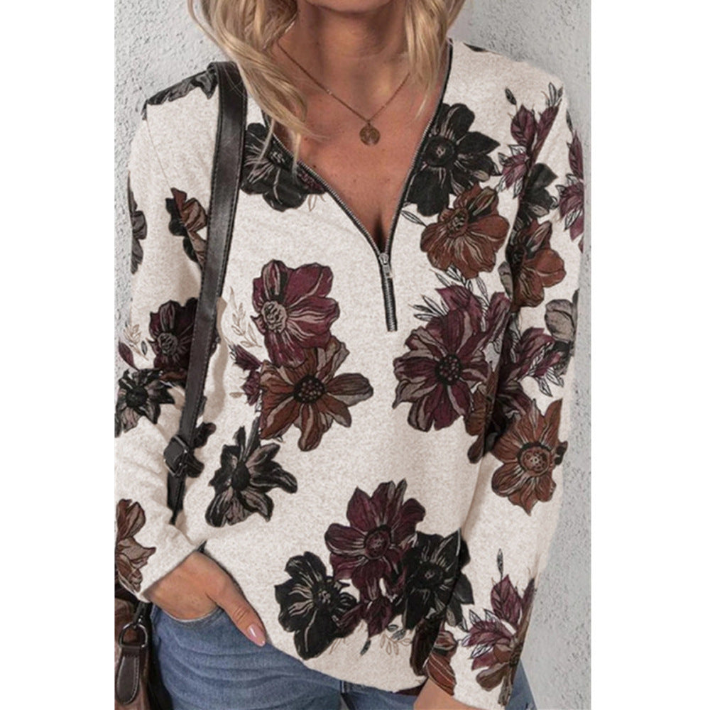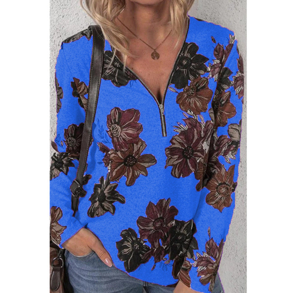 Long Sleeve Floral Blouse with Zip Up V-Neck