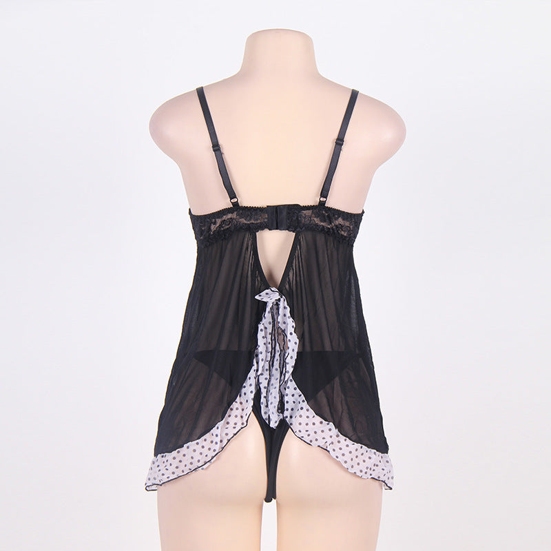 Playful with its polka dot bra and skirt, this semi-sheer mini-dress features lacy details to give it a more elegant update.