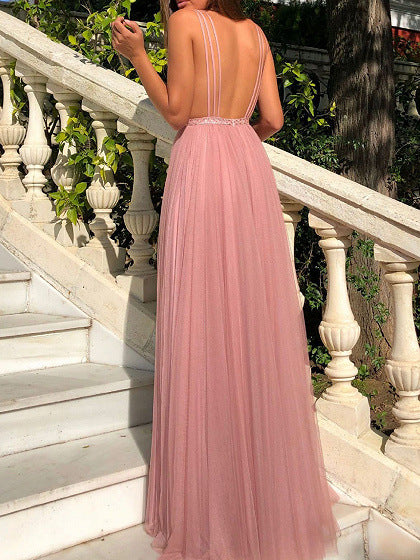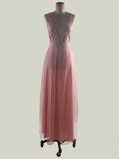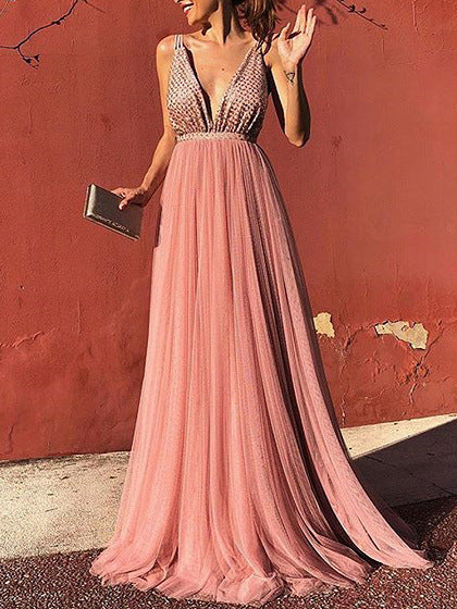 Elegant and sophisticated, the Women's Princess Style Pink Dress with V-neck and Maxi Hem is versatile enough for any formal occasion. It features a steep V-neck with strappy shoulders and a flowing maxi skirt.