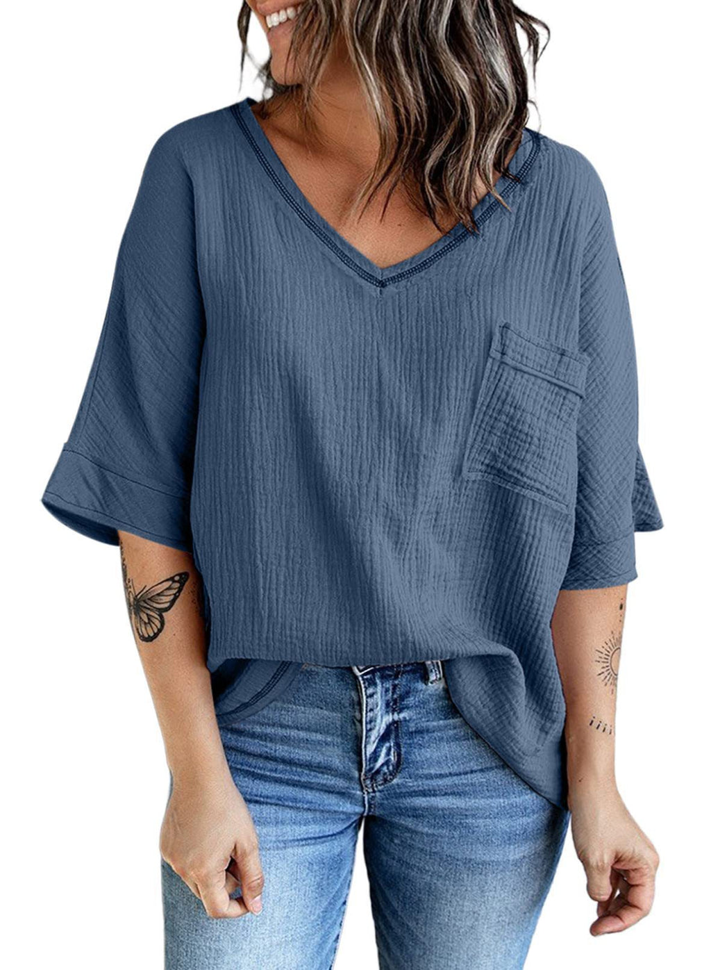 Casual and chic, the V-neck Three Quarter Length Tee with Oversized Pocket is a cute top for casual daily wear. The top features a texture feel that makes it stand out from other such blouses.