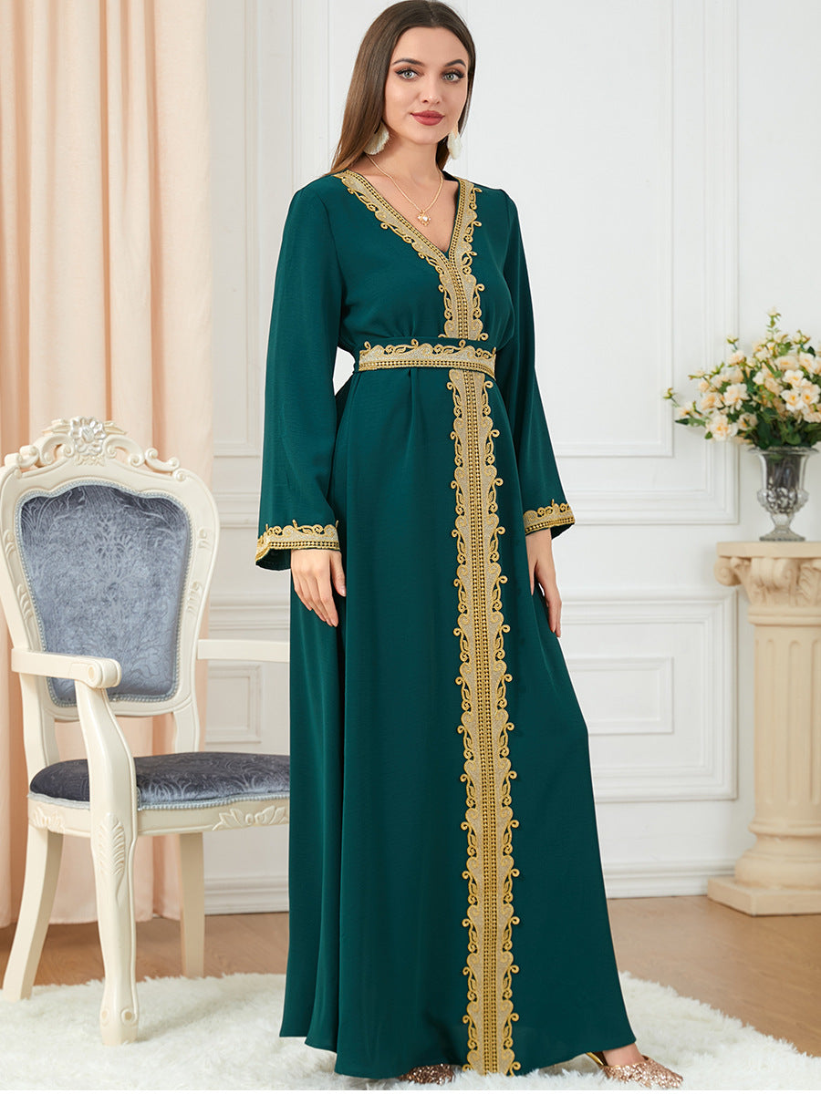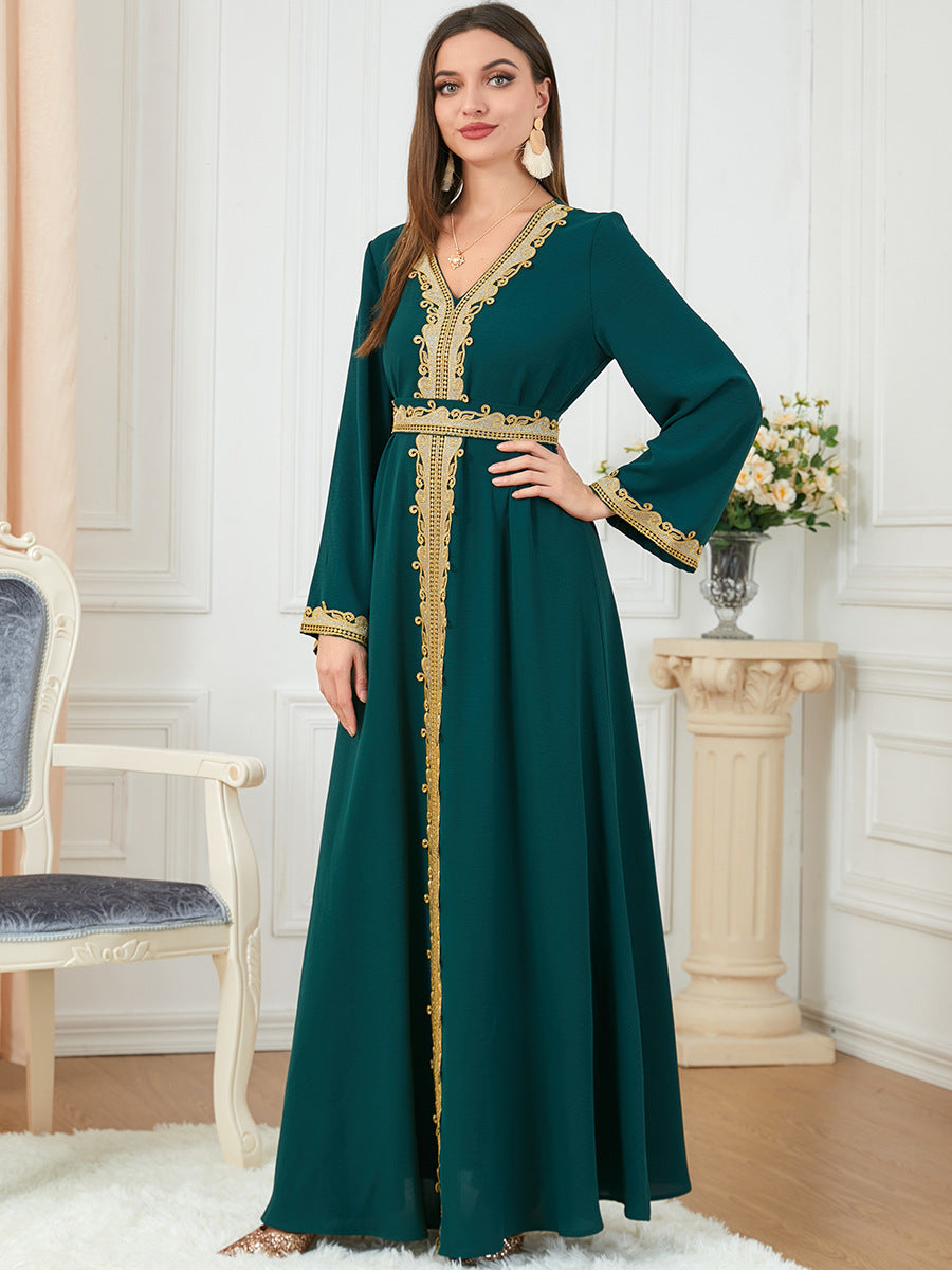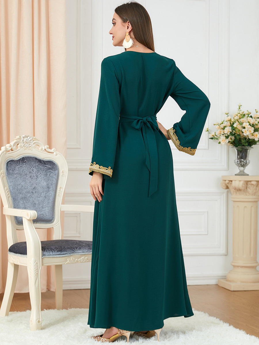 Rich, forest green and elegant gold work in harmony to create the intricately detailed Women's Long Sleeve Green and Gold Velvety Maxi Gown.