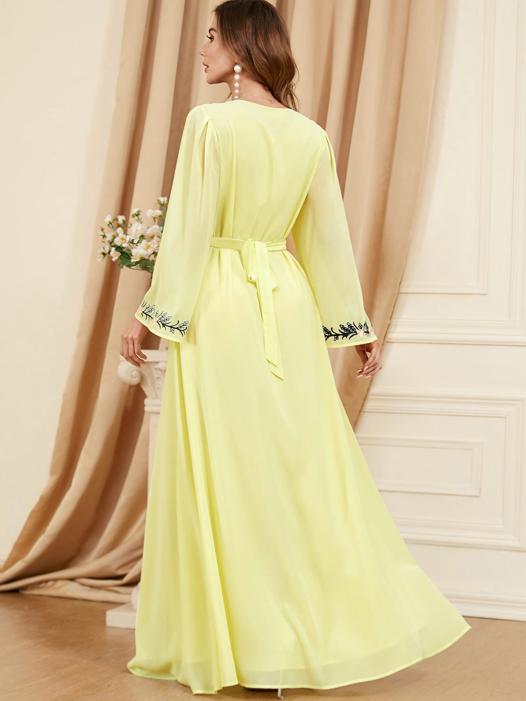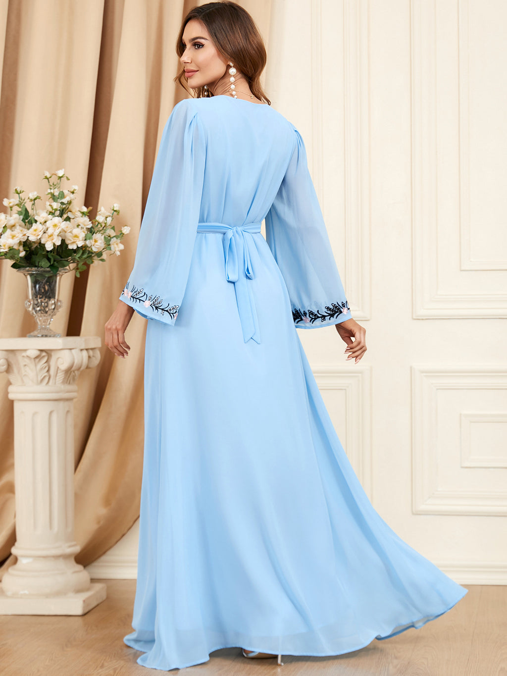 Bring fresh color to your wardrobe with the springtime-inspired Women's Long Sleeve Maxi Dress with Shimmery Golden Details. It comes in blue, mint or pale yellow.