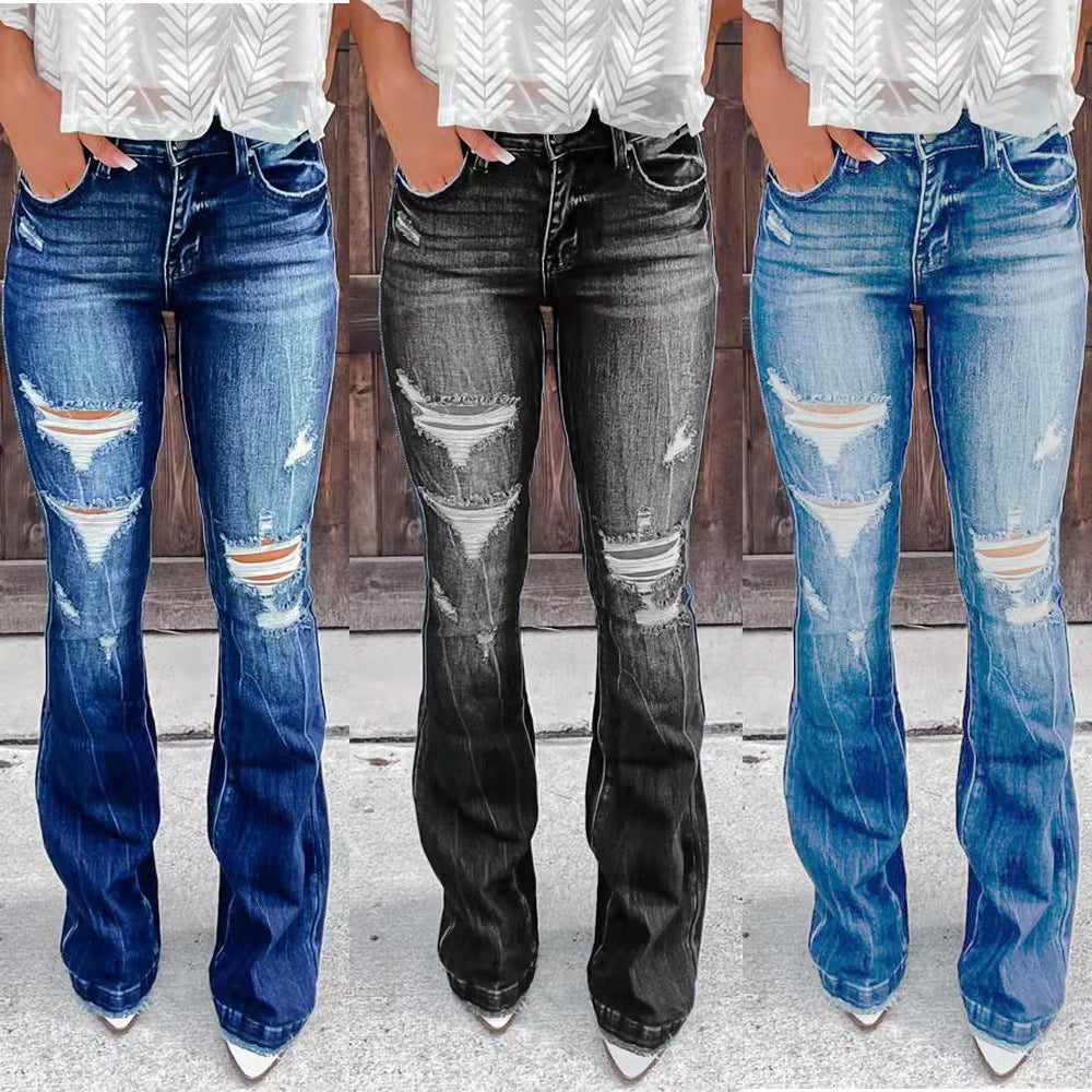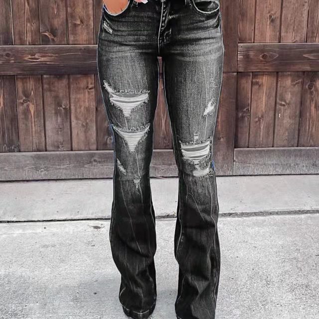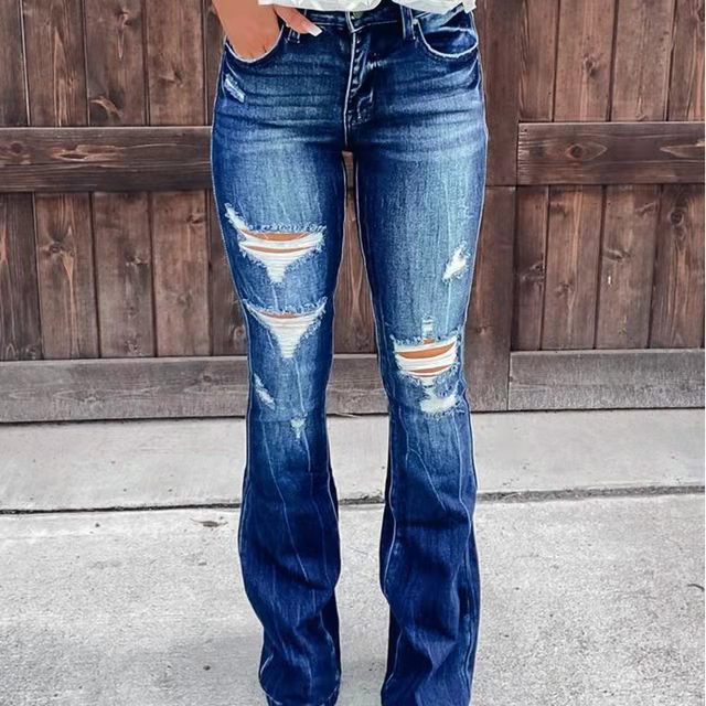 The look of ripped jeans and flared legs is back in style, and you can jump on the trend with these Women's Flared Leg Denim Jeans with Rips. These jeans come in light, dark or black denim.